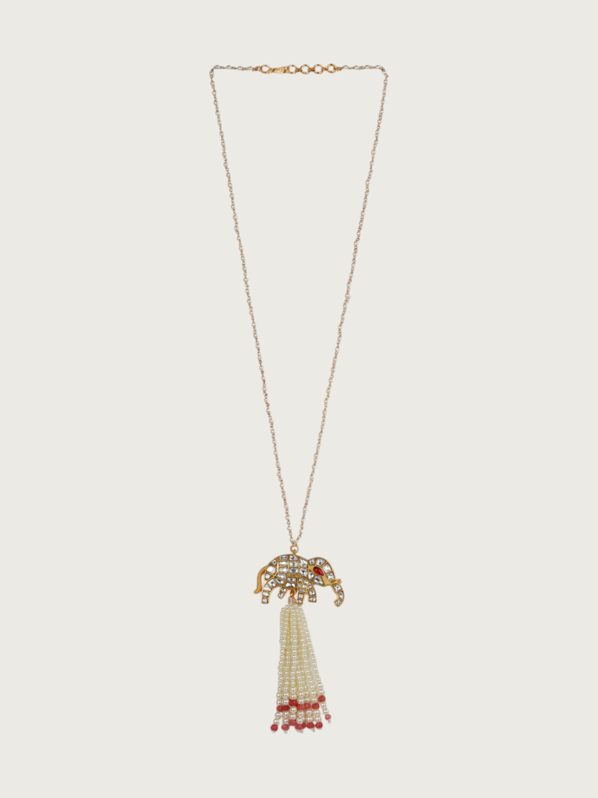 Whimsical, regal, and full of character—this necklace showcases a beautifully enameled elephant pendant, a symbol of strength and good fortune. The gold tones are delicately balanced by cascading strands of white pearls tipped with green beads, adding a playful yet elegant movement to your neckline.