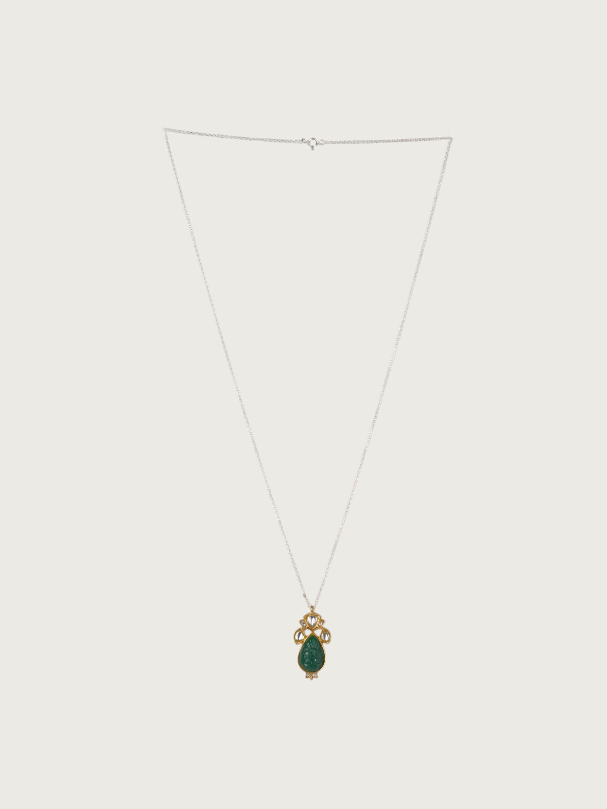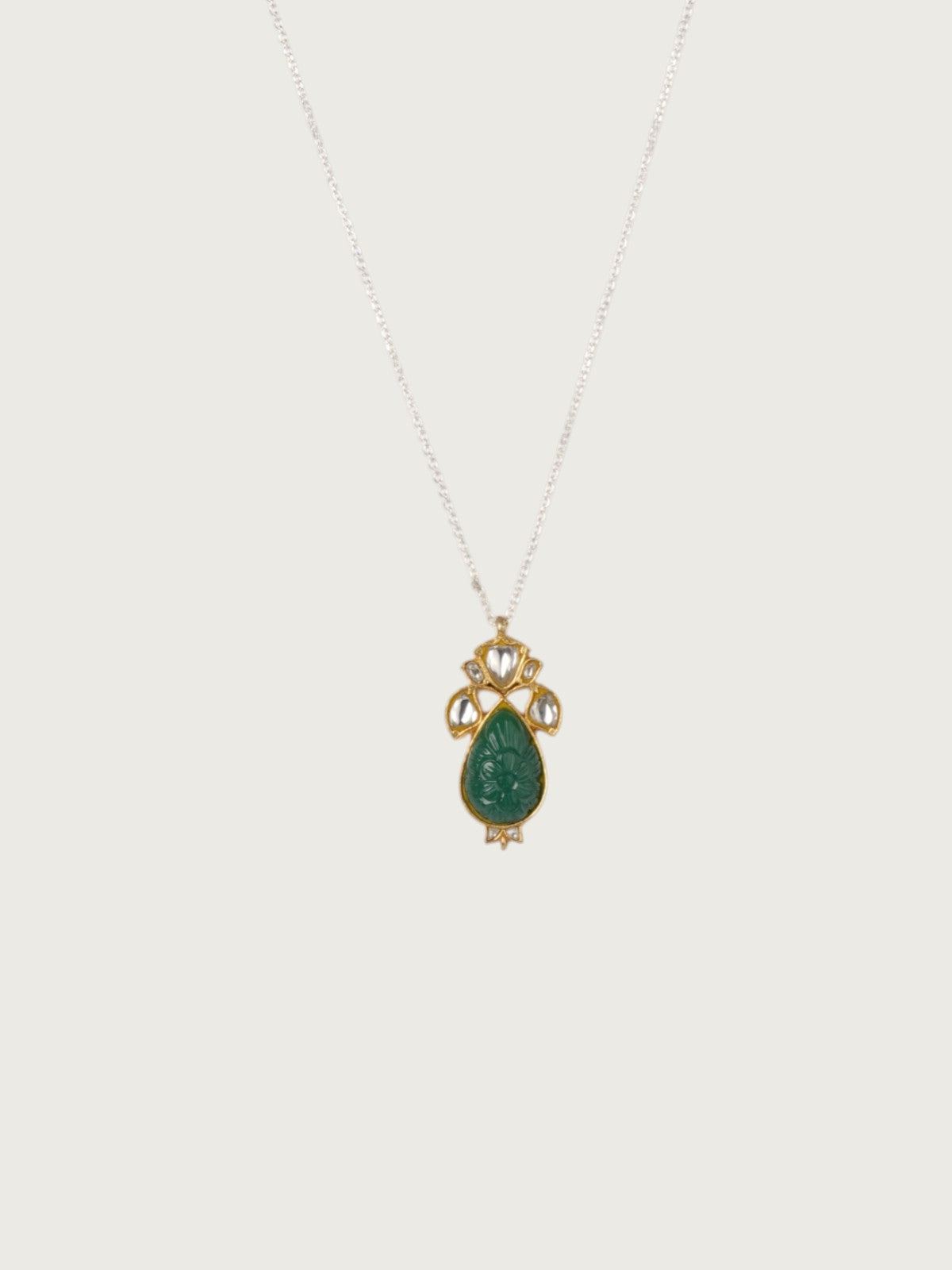 Elevate your style with this elegant pendant necklace featuring a hand-carved green stone centerpiece framed in gold plating. The teardrop-shaped pendant is adorned with classic kundan work on top, forming a delicate floral silhouette. Set on a minimal silver chain, this necklace is a perfect balance of tradition and simplicity. The floral carving and subtle sheen make it a timeless addition to your jewelry collection.
