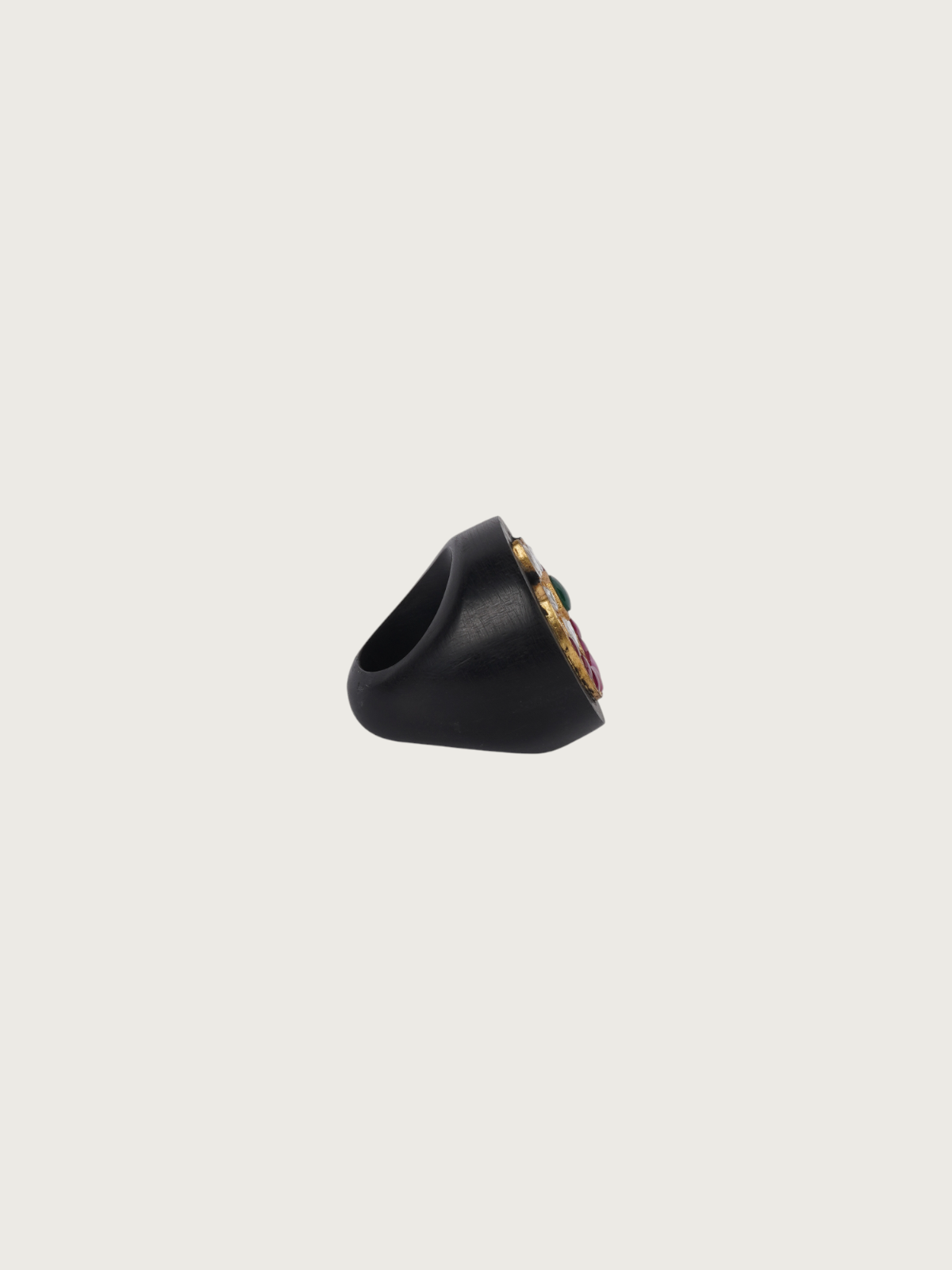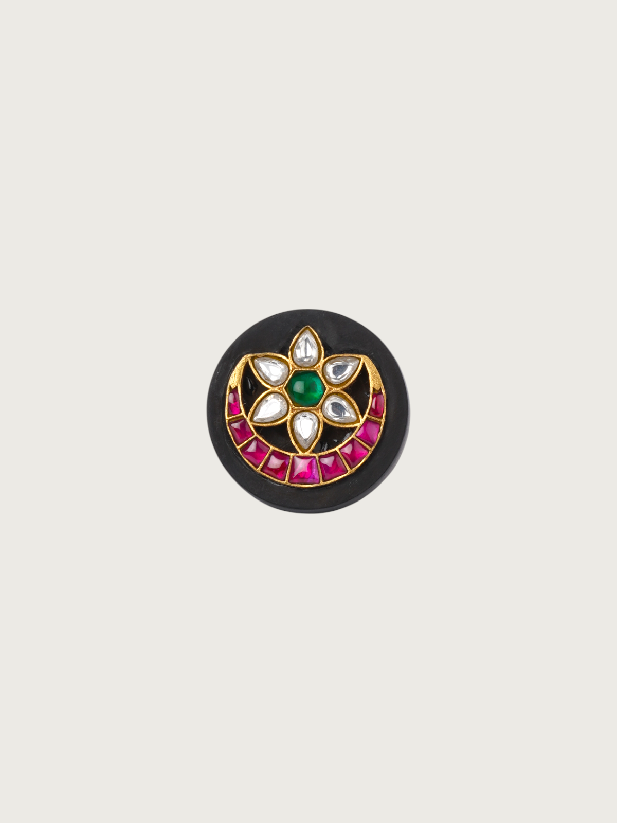 A bold blend of tradition and edge, this black statement ring from Tver features a striking circular black base. At the center, a radiant green stone is surrounded by petal-shaped white kundan-style accents, forming a floral motif that blooms with elegance. Below, a crescent arc of deep pink-toned square stones adds rich contrast and regal flair.