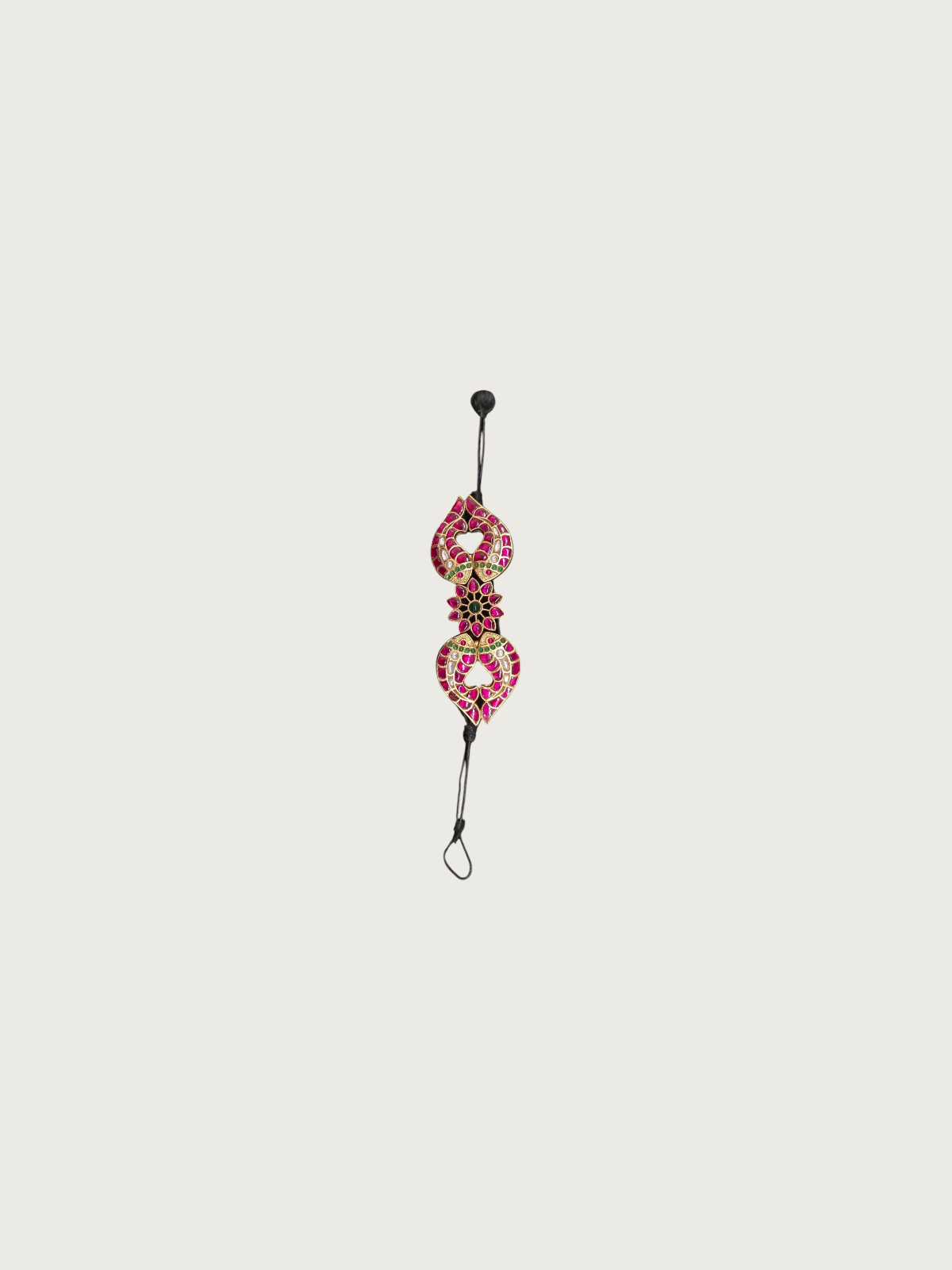 Elevate your accessory collection with these statement meenakari bracelets, featuring dual drop-shaped motifs set with vibrant stones in striking color combinations. The intricate handwork includes bold enamel patterns, a heart cutout centerpiece, and a floral cluster that blends traditional aesthetics with a modern edge.