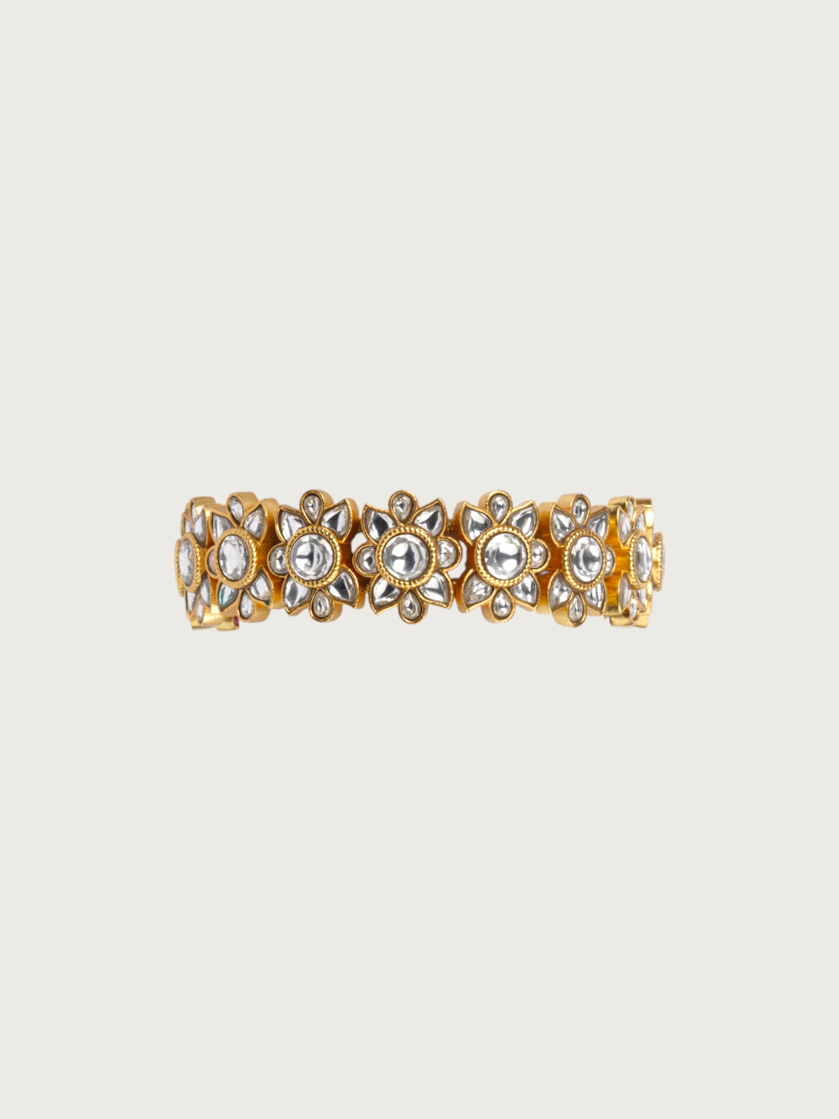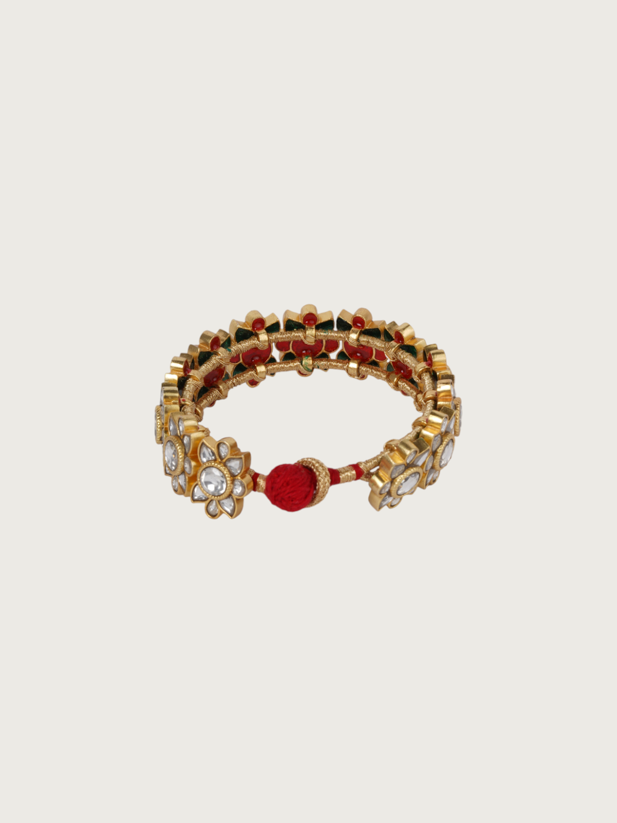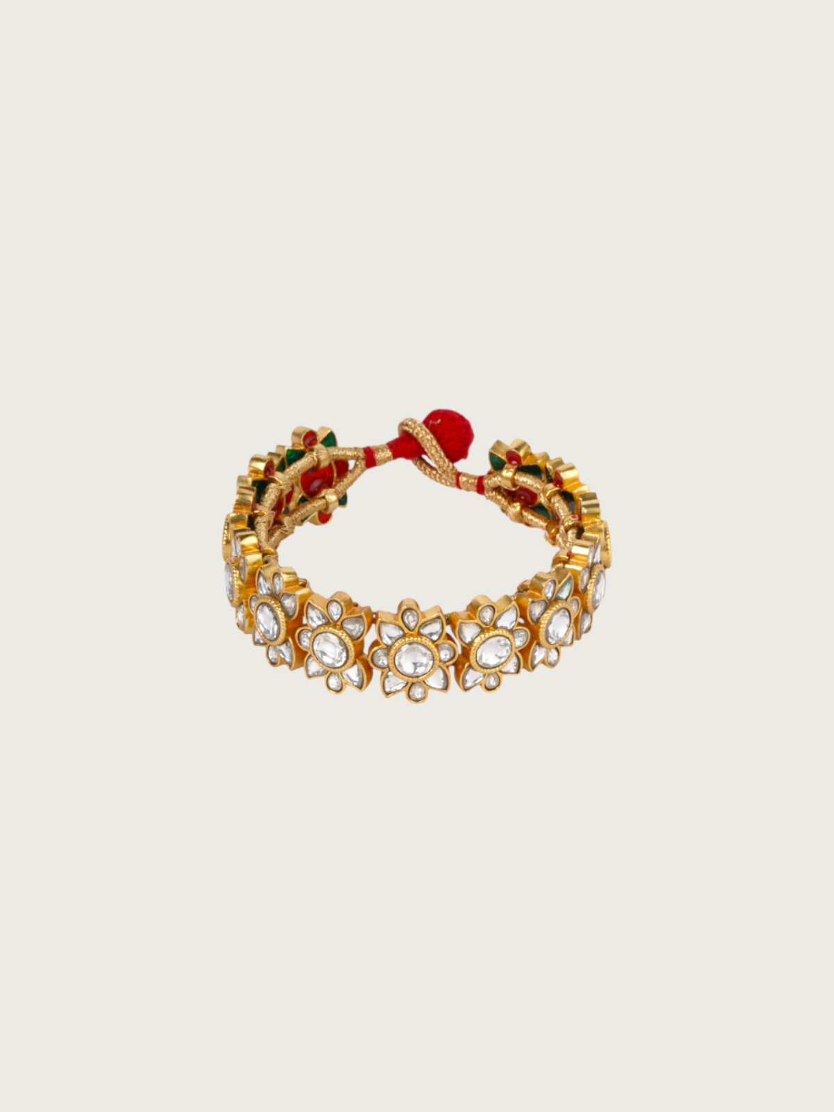 A radiant blend of tradition and finesse, this Tver bracelet features intricate floral motifs outlined in gold plating and adorned with glimmering white stones. Each petal and center stone is precisely handcrafted, creating a harmonious rhythm of light and texture. Finished with a red adjustable thread tie, the design captures an authentic handcrafted charm with a touch of regal grace — perfect for elevating any statement look.