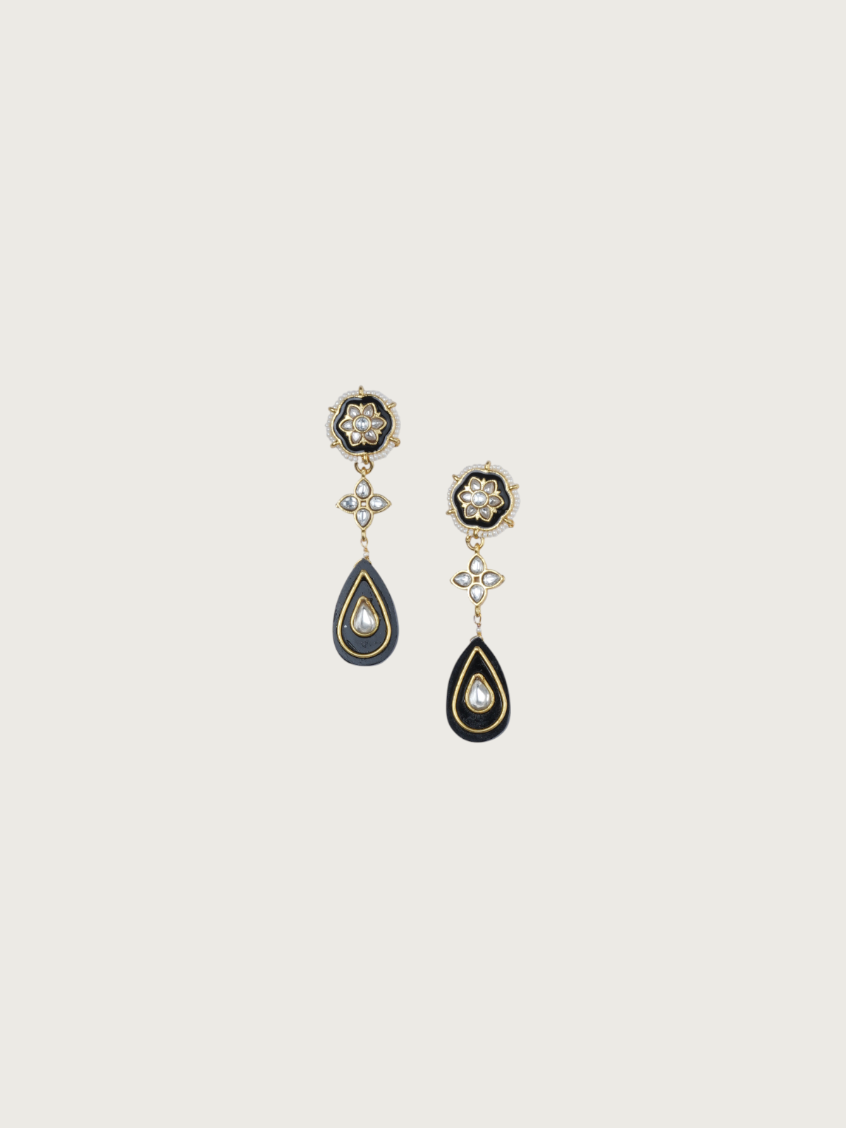 Elevate your style with these striking black enamel dangler earrings crafted in a unique tear drop silhouette. Set in a gold-plated frame, the earrings feature intricate kundan-style detailing at both the stud and drop, complemented by a delicate floral motif at the top. The contrast of glossy black enamel against the white kundan accents creates a bold yet graceful look—perfect for adding a refined edge to both contemporary and ethnic ensembles.