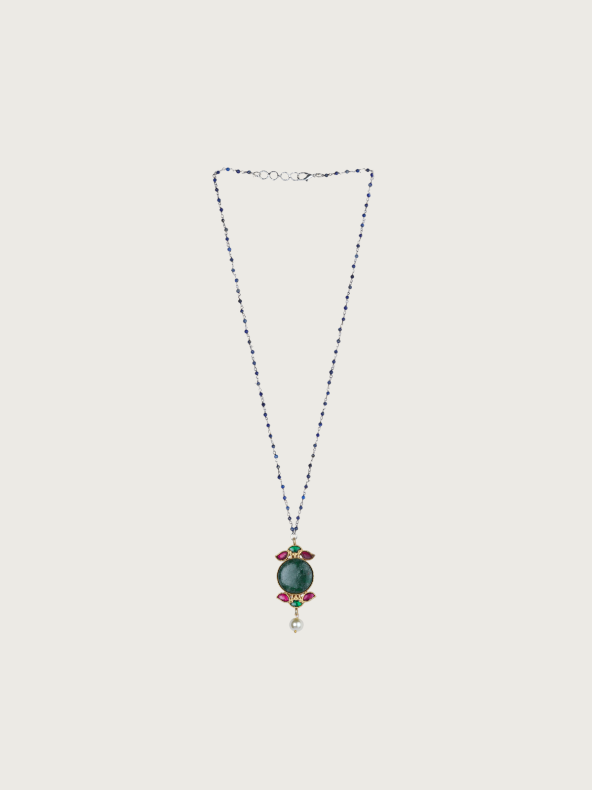 Add a touch of vibrant charm to your ensemble with this elegant pendant necklace featuring a deep green center stone. Set in a gold-toned frame, the circular pendant is adorned with leaf-shaped pink and green-colored accents, bringing in a regal pop of color. A single pearl drop at the base enhances the refined aesthetic, while the delicate beaded chain in blue hues complements the centerpiece perfectly. This necklace is ideal for those who enjoy a mix of classic and colorful elements in their jewelry.