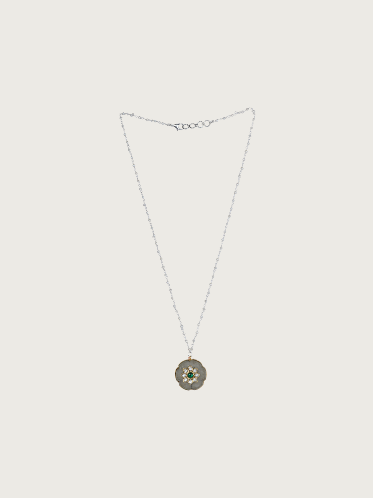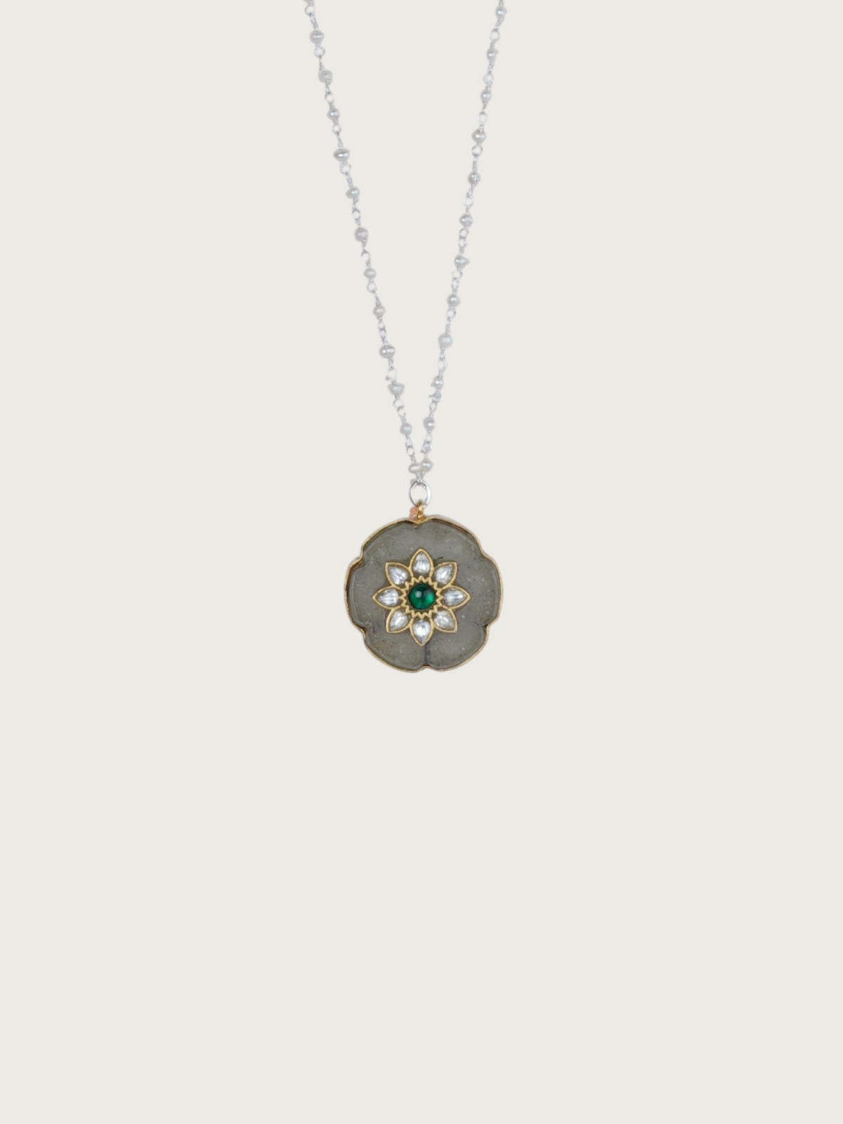 Refined and timeless, this handcrafted necklace features a soft grey pendant carved in the shape of a delicate flower. At its center, a radiant green element is surrounded by subtle kundan-inspired detailing that exudes quiet charm. Strung on a dainty silver-toned chain, the design combines elegance with everyday versatility.