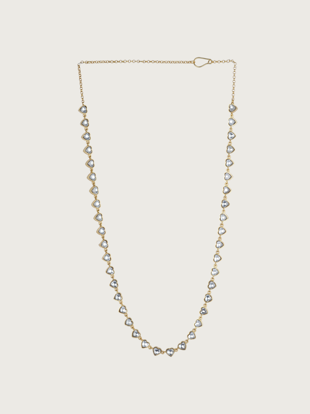 This elegant necklace from Tver features a series of delicate heart-shaped kundan elements, intricately linked to create a graceful chain of sparkle and charm. Each heart frame houses a radiant white kundan stone, set in a gold-plated base that enhances its brilliance. The symmetrical design offers a modern romantic flair, making it a beautiful addition to both traditional and contemporary looks.