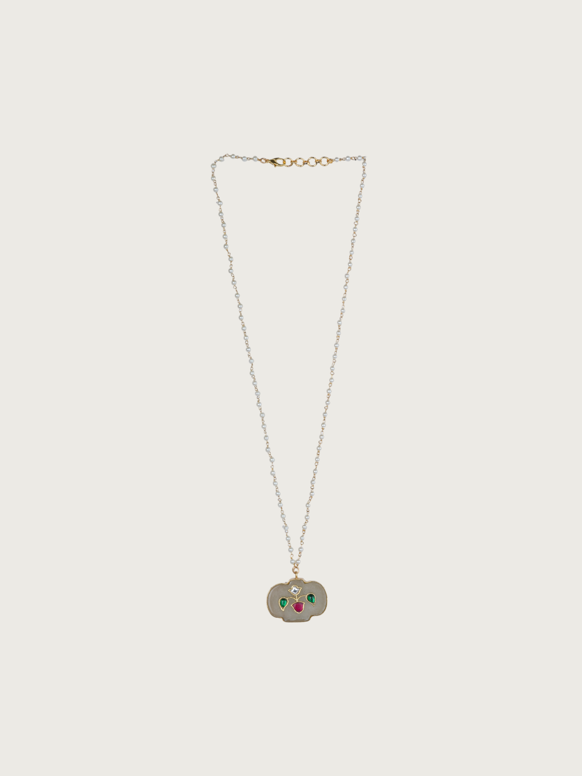Add a subtle touch of heritage charm to your everyday look with this handcrafted mini pendant necklace. Suspended on a delicate beaded chain, the pendant features a muted pastel grey enamel base adorned with intricate kundan work. The design includes green and pink accents in a floral-inspired motif, giving it a refined elegance with a hint of playfulness.