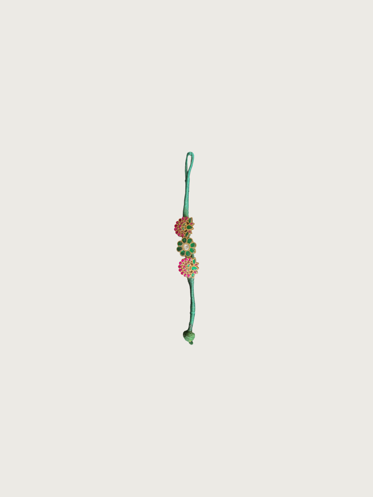 Vibrant and handcrafted, this green thread bracelet features a trio of ornate floral elements designed in traditional meenakari style. The contrast of red and green enamel with the gold-toned base makes this piece pop with visual interest. Each flower is detailed with intricate petal work, set along a vivid green adjustable thread that gives the bracelet a boho-meets-heritage feel. Wear it solo for a hint of color or layer it with other pieces for an eclectic stacked look.