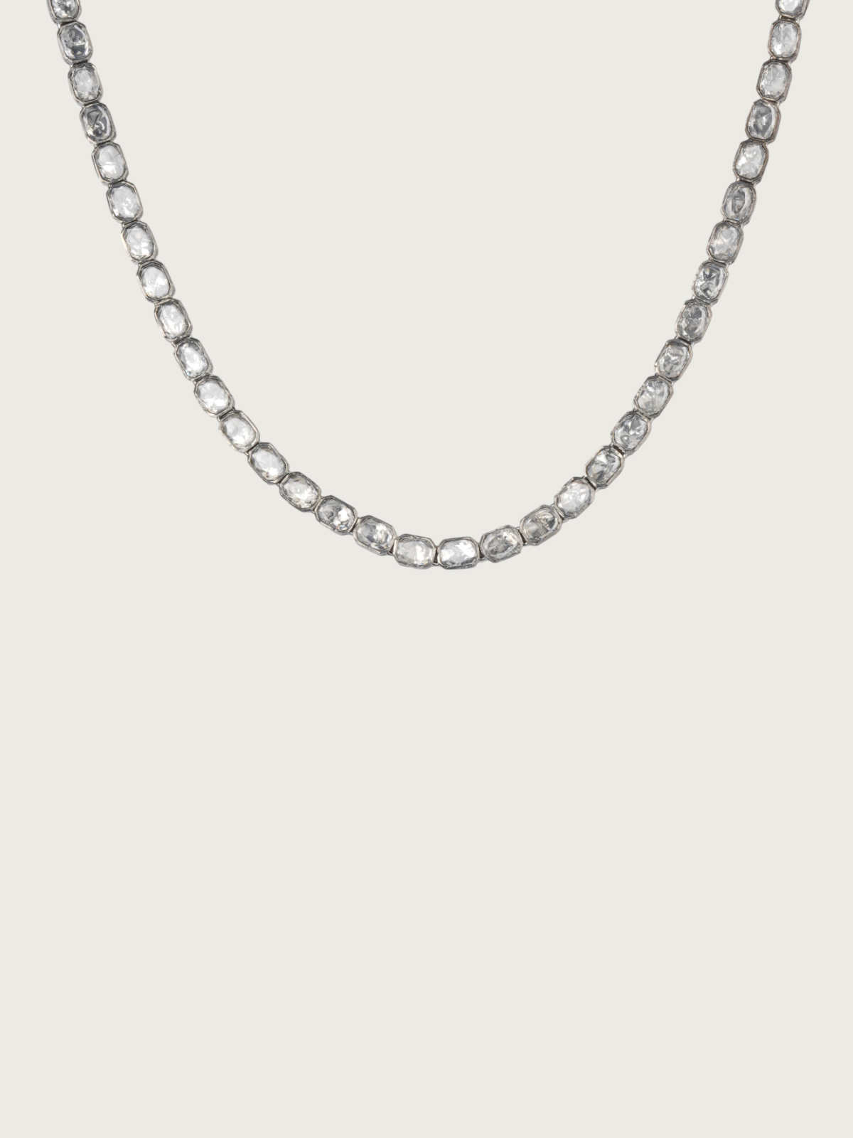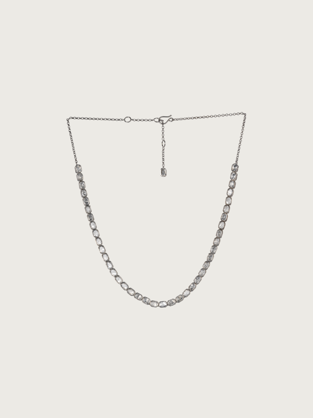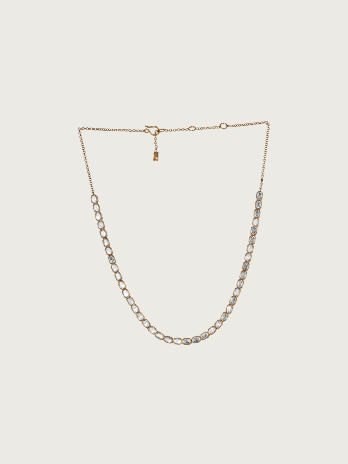 This minimalist kundan line necklace features a seamless arrangement of finely cut kundan stones set in gold-plated and silver-toned frames. Its timeless linear design adds a refined touch to any look — whether worn alone or layered with statement pieces. The classic symmetry and sparkle make it a versatile go-to for both traditional and modern styling.
