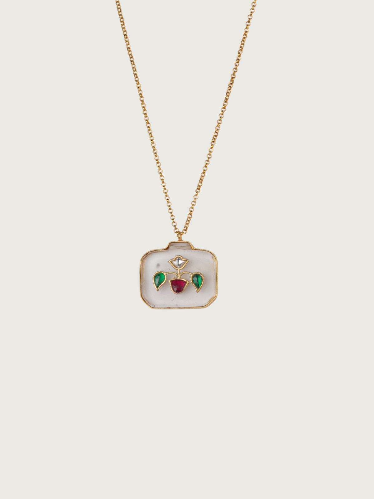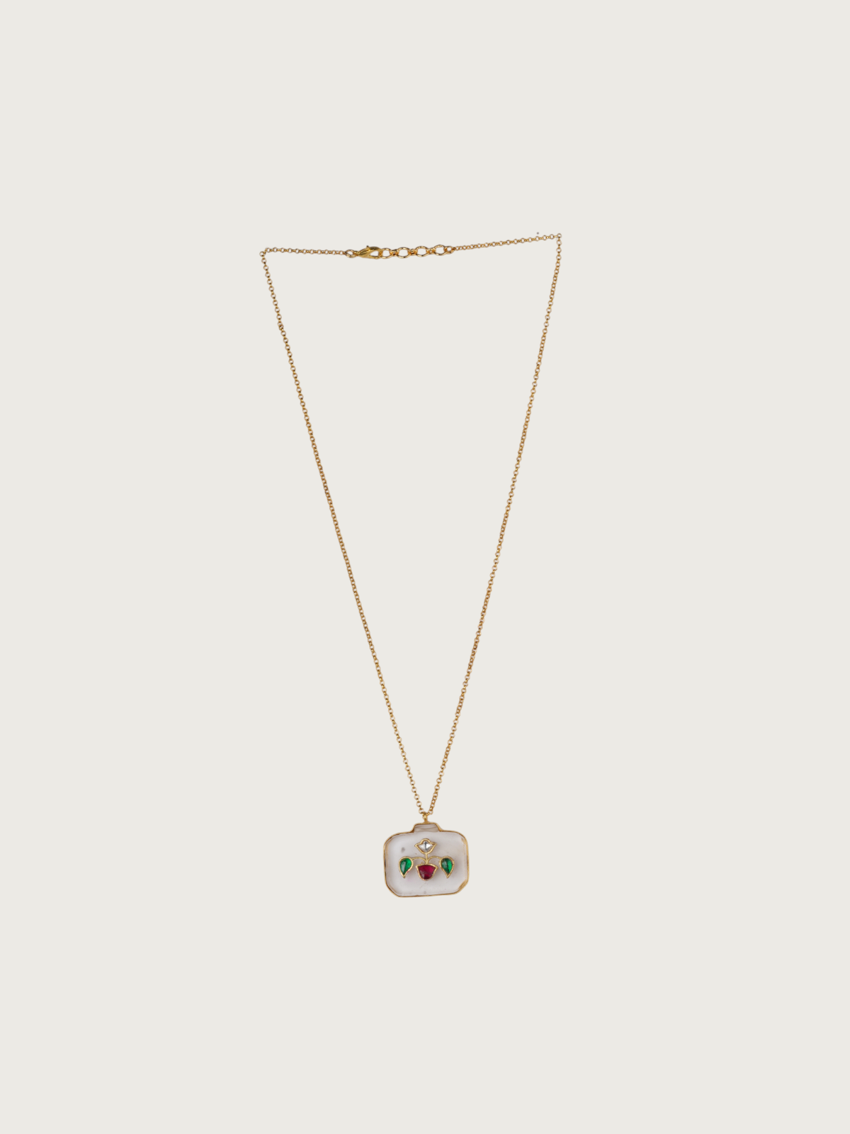 A delicate expression of heritage and elegance, this gold-plated necklace features a square white enamel pendant adorned with a floral motif in red and green. Crafted with intricate meenakari work, the design is symbolic of traditional Indian artistry, yet modern in its simplicity. The chain is sleek and minimal, allowing the pendant to take center stage.