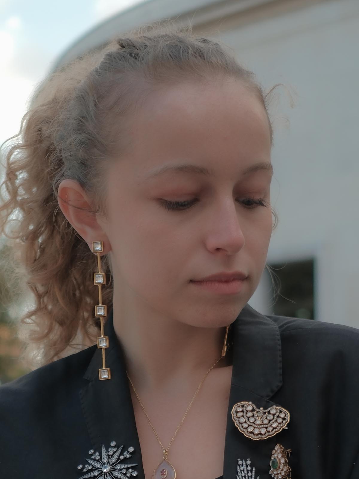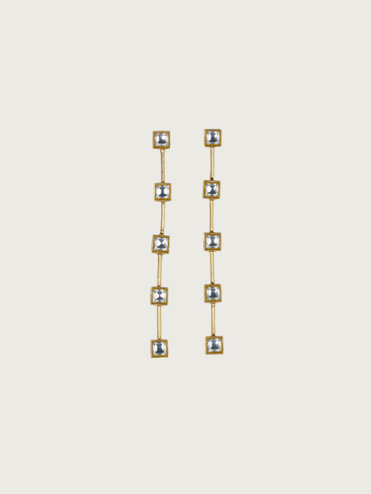 Una fusión perfecta de minimalismo y elegancia de inspiración mogol , estos pendientes colgantes bañados en oro, hechos a mano, presentan una disposición lineal de piedras jadau cuadradas , ofreciendo una estética refinada y moderna, propia de una reliquia familiar. Su delicado diseño geométrico crea una silueta elegante y alargada, perfecta para un estilo llamativo con un sutil toque de encanto vintage .