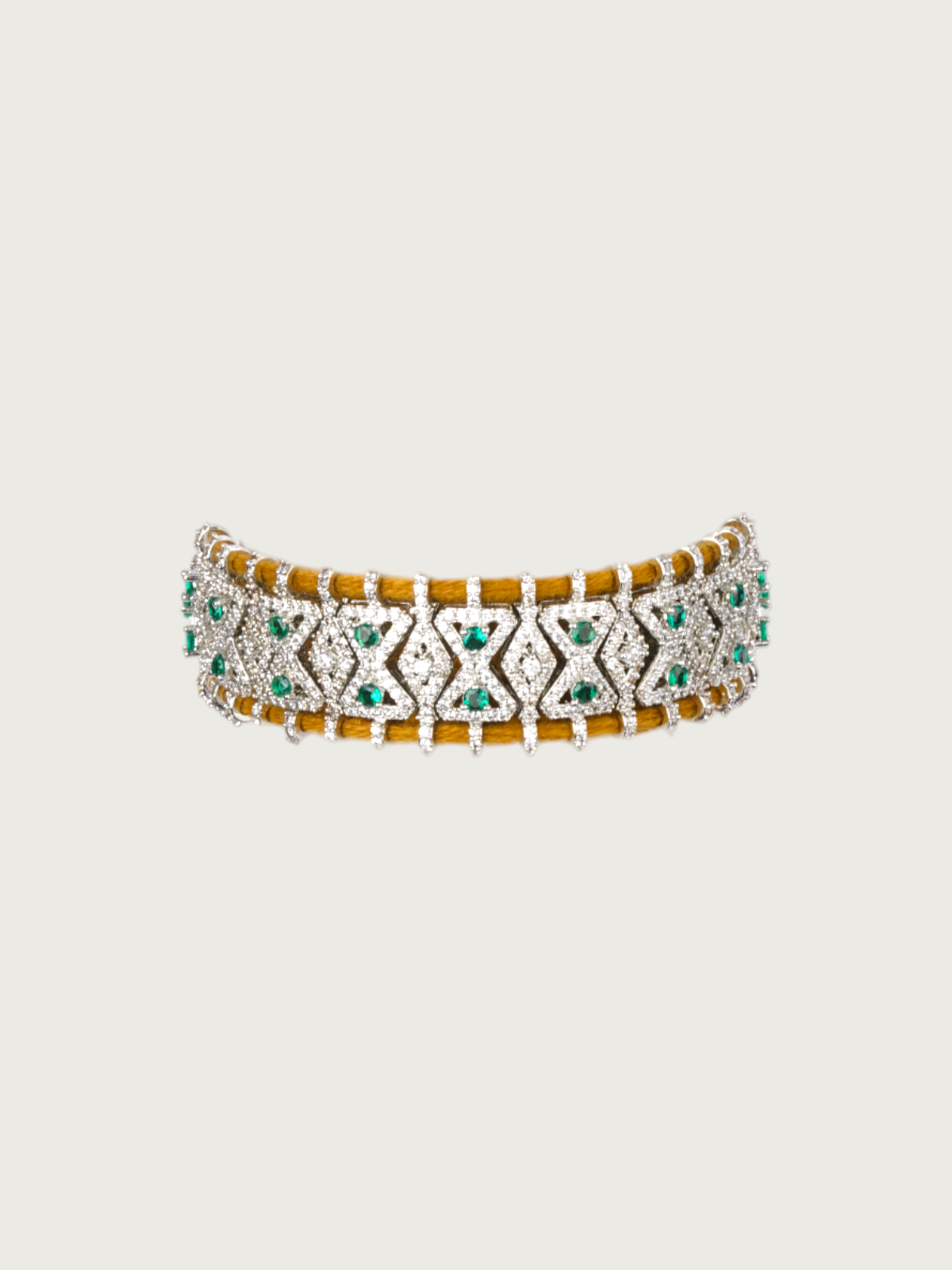 The Tver bracelet showcases a captivating fusion of mustard-toned threadwork and intricate silver-toned detailing. Adorned with a series of sparkling white and green stones in an ornate geometric pattern, this handcrafted bracelet radiates contemporary artistry with a traditional soul. The soft woven texture contrasts beautifully with the brilliance of its embellishments, creating a statement piece of refined allure.