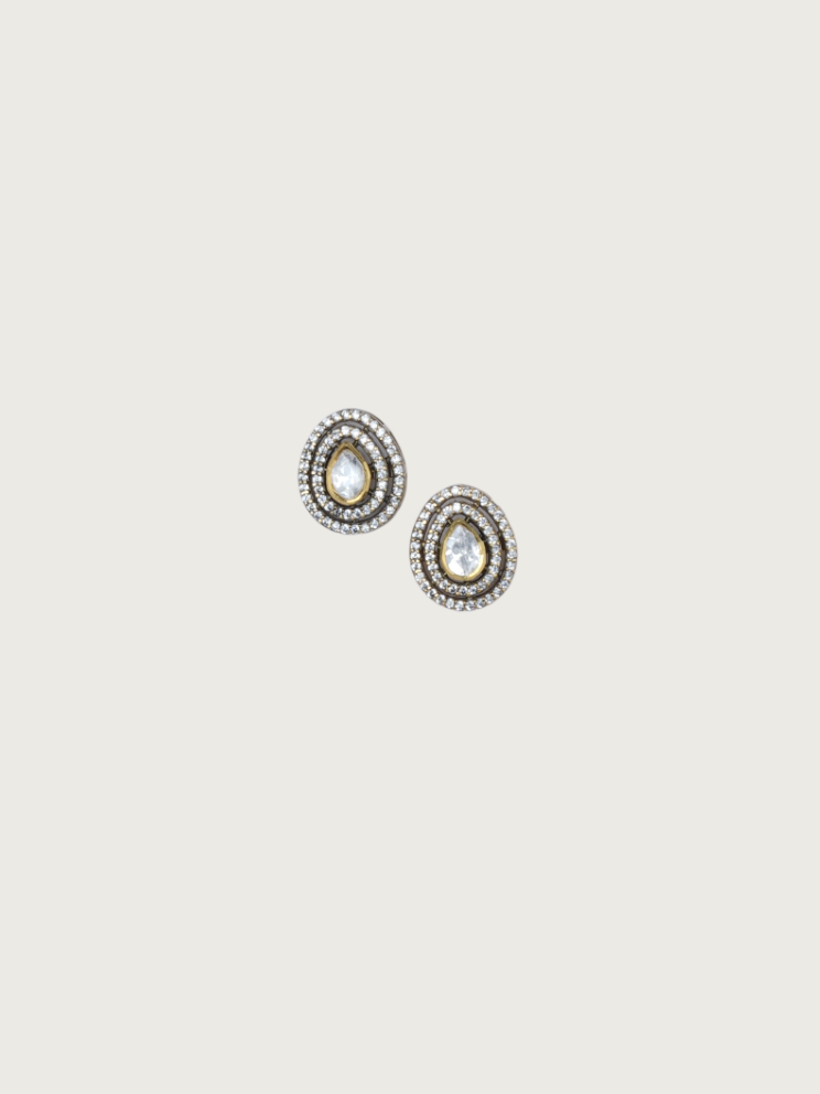 A dainty celebration of elegance, these pear-shaped stud earrings are designed to make subtle statements. Set in a victorian-toned, the center pear-cut stone is beautifully highlighted by concentric rows of delicate sparkling accents. Their classic teardrop silhouette lends timeless charm, making them a refined choice for minimal elegance or graceful layering.