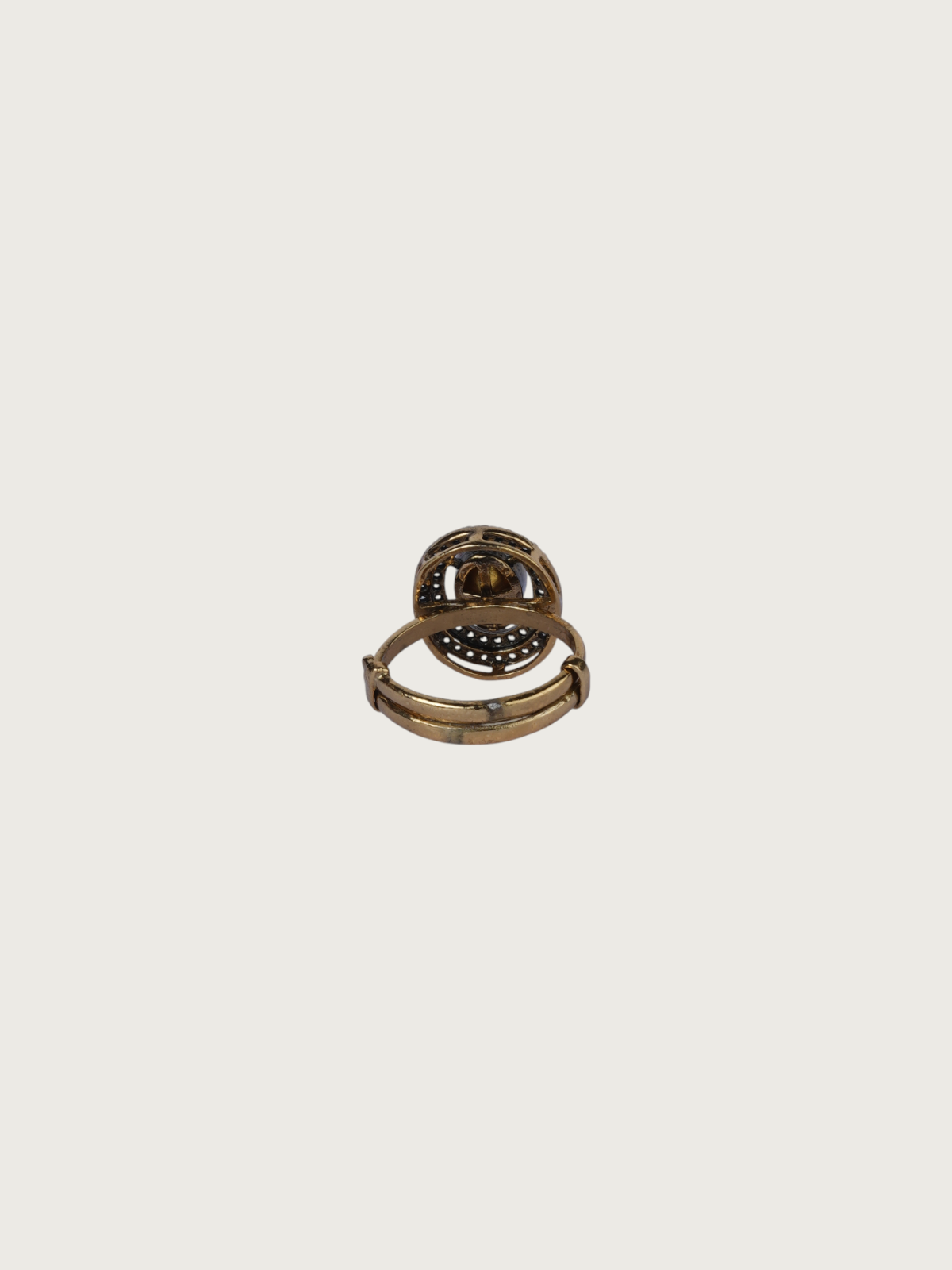 Make a statement with our dual halo kundan ring crafted in a rich victorin-toned finish. The oval-shaped kundan centerpiece is surrounded by two delicate rows of sparkling white stones, creating a layered halo effect that catches the light beautifully. Its antique polish adds a vintage charm, while the adjustable band ensures a comfortable fit for any finger size.