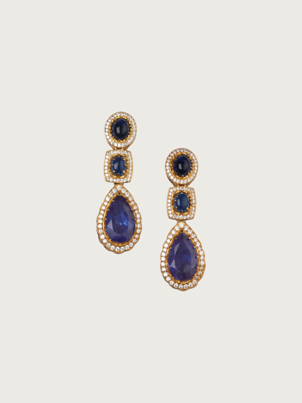 Add a regal touch to your look with these exquisite purple drop earrings. Featuring a triple-stone layout, these earrings are designed with oval, rectangular, and pear-shaped purple stones encased in a warm gold-toned frame. Each stone is bordered by a delicate halo of shimmering CZ accents, enhancing the vibrance of the blue hues. The teardrop base lends a graceful flow, while the structured trio design adds drama and elegance.