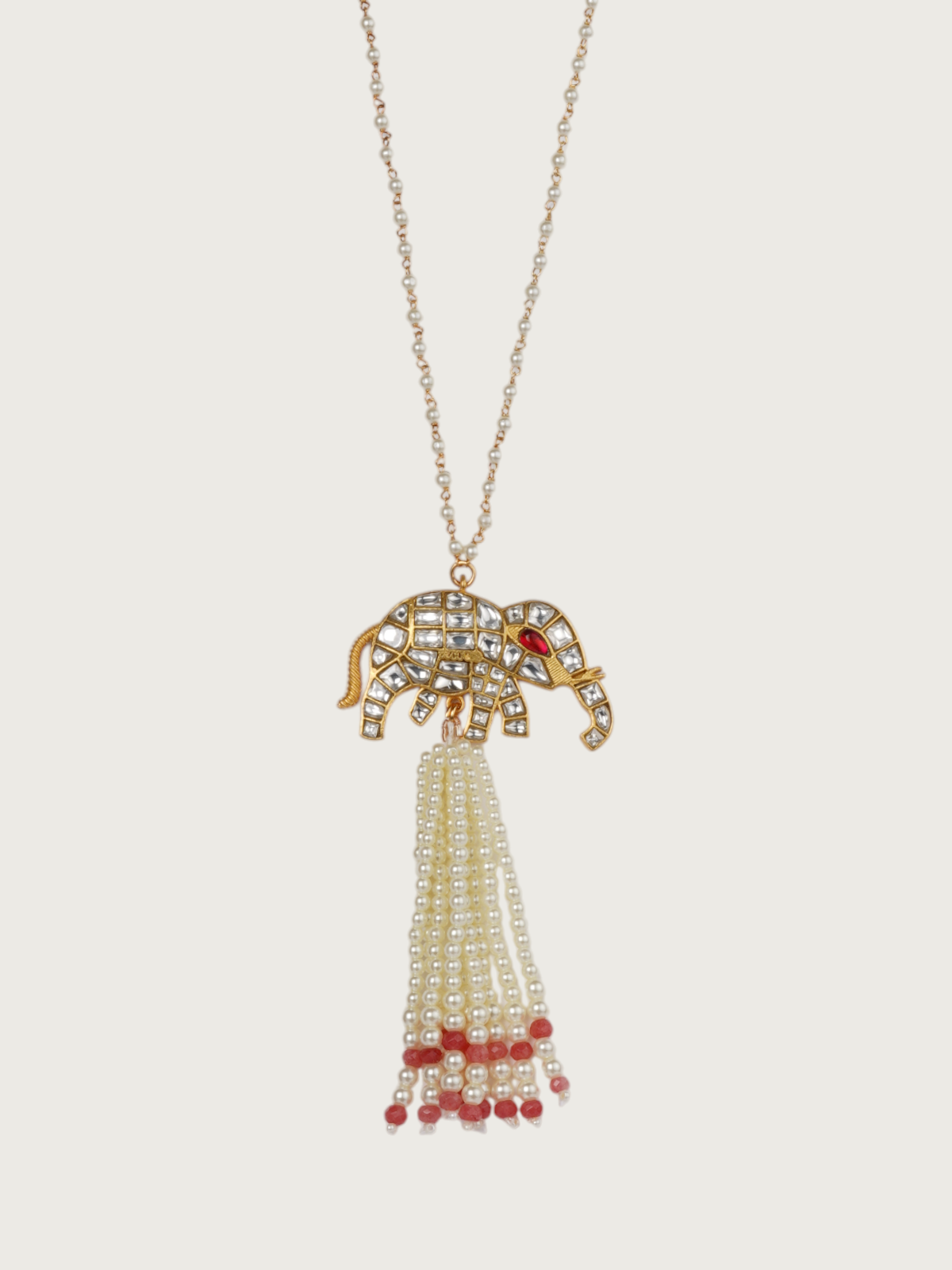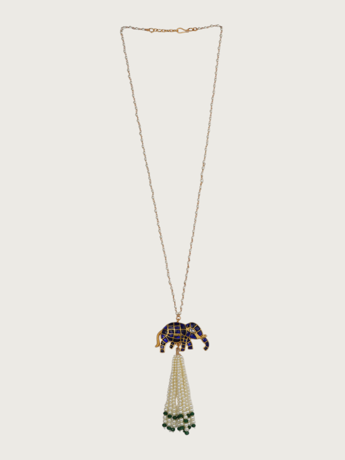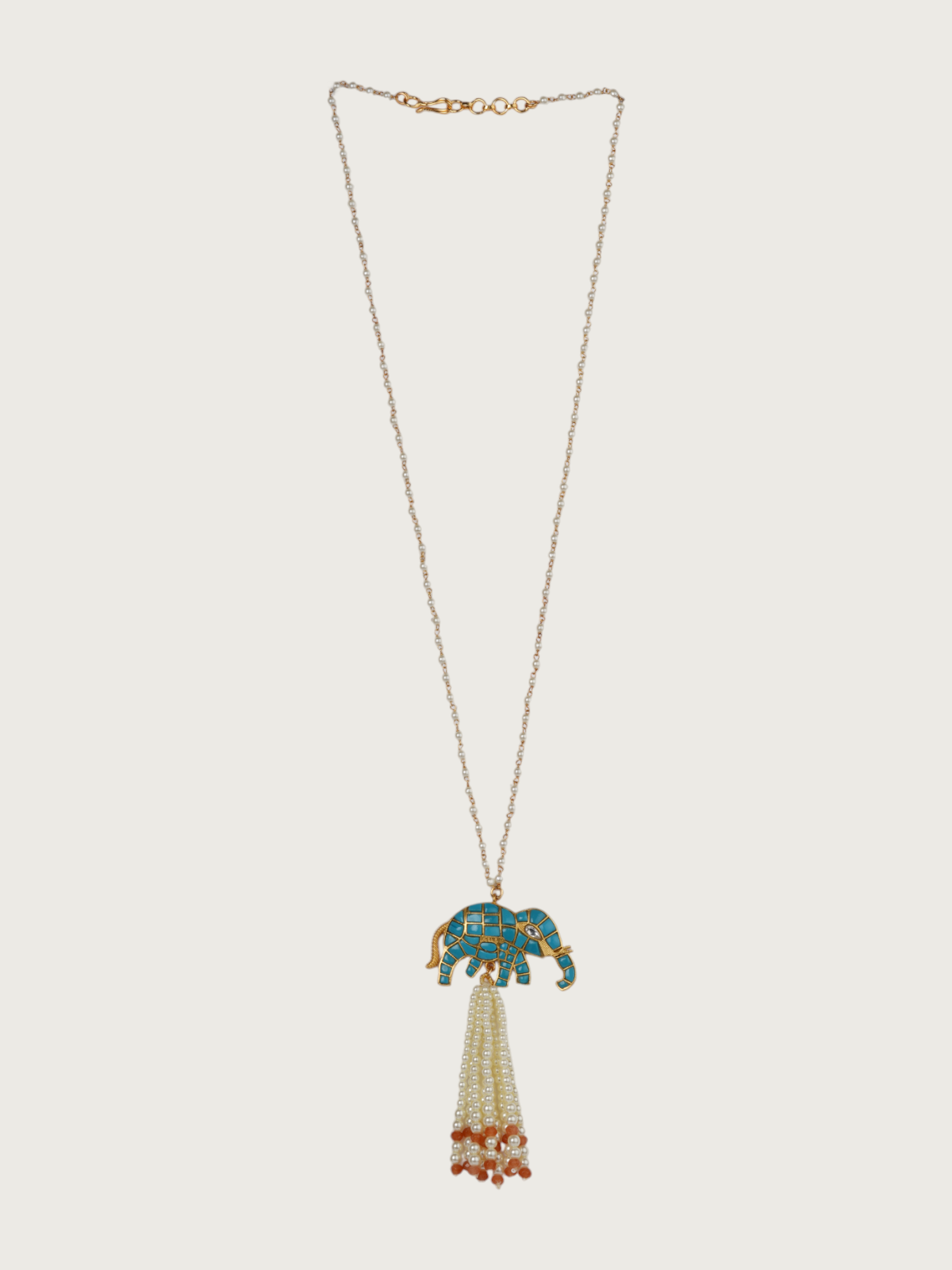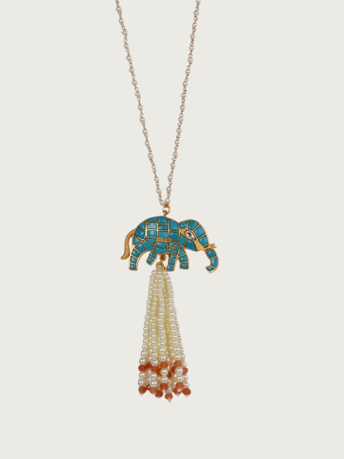Whimsical, regal, and full of character—this necklace showcases a beautifully enameled elephant pendant, a symbol of strength and good fortune. The gold tones are delicately balanced by cascading strands of white pearls tipped with green beads, adding a playful yet elegant movement to your neckline.