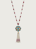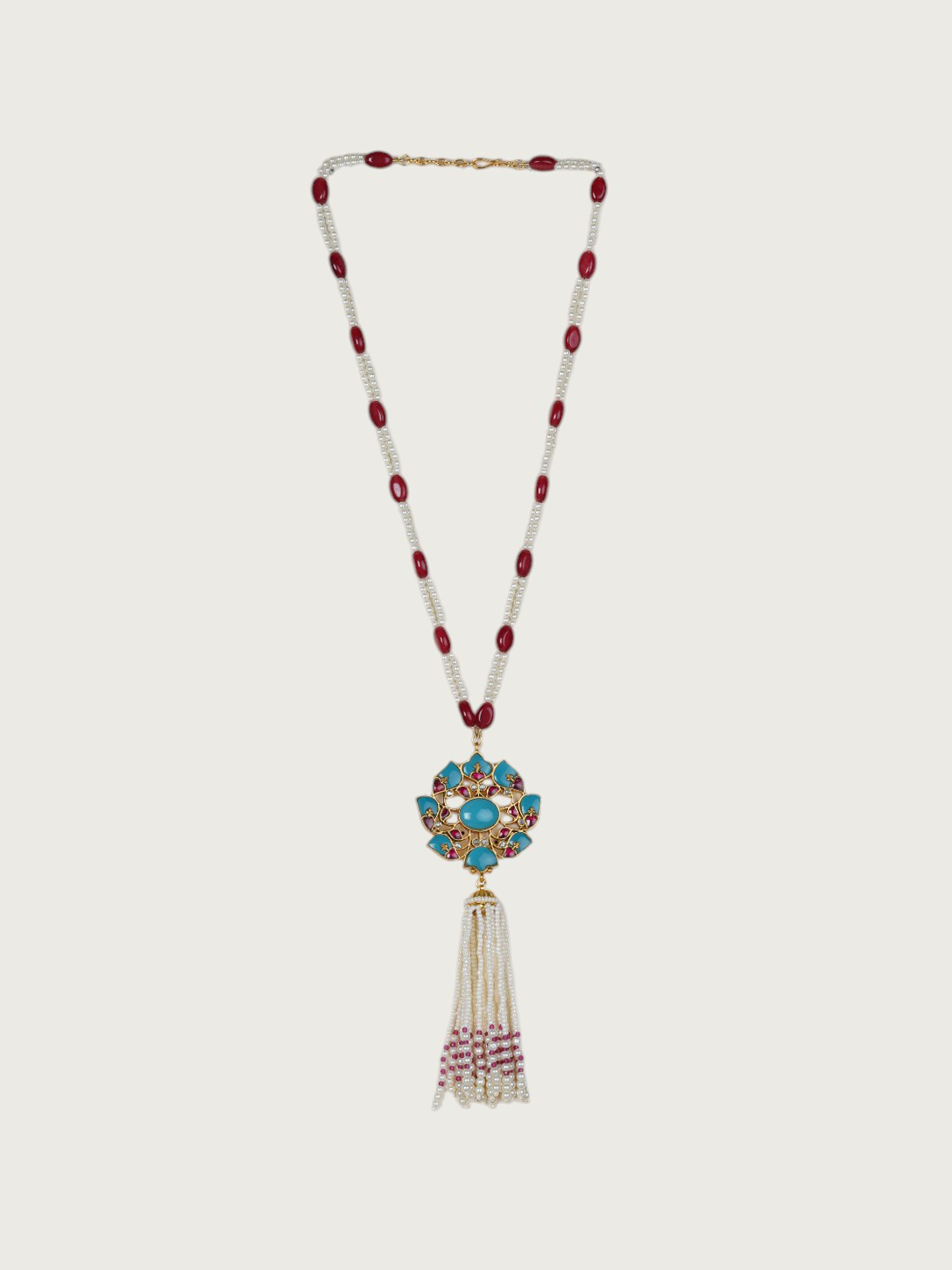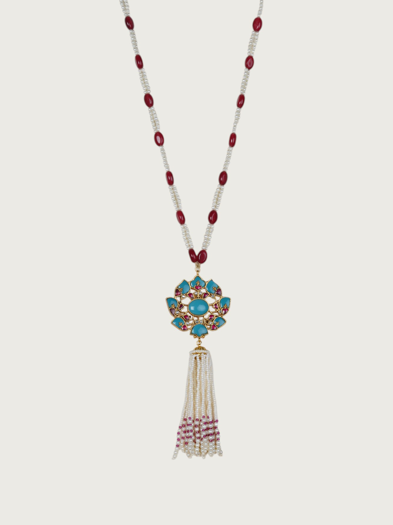 Make a vibrant statement with this handcrafted turquoise lotus pendant necklace. The radiant blue lotus motif is accentuated by intricate jadau work in red and white, creating a beautiful balance of tradition and artistry. Strung with a dual-strand arrangement of deep red and tiny white pearl-like beads, the necklace culminates in a luxurious pearl tassel that adds fluidity and grace to the design.