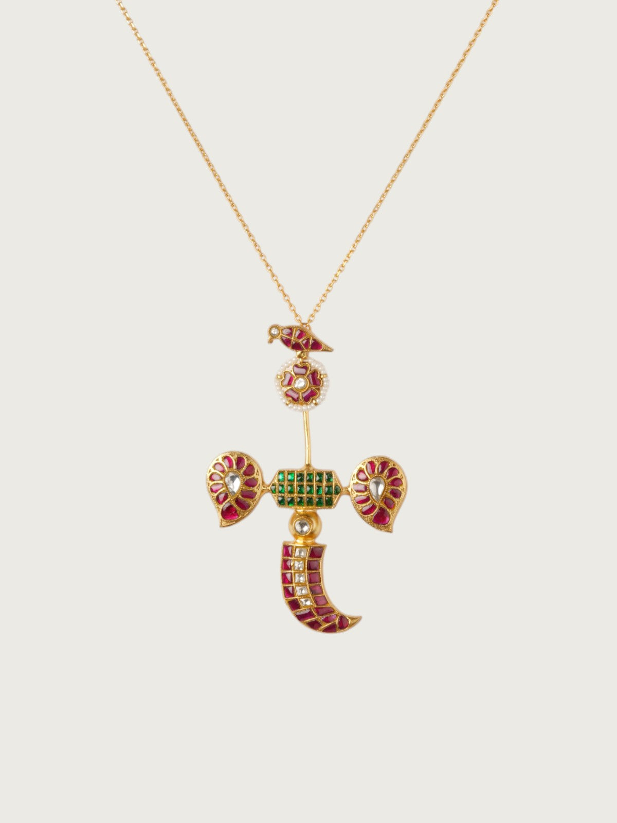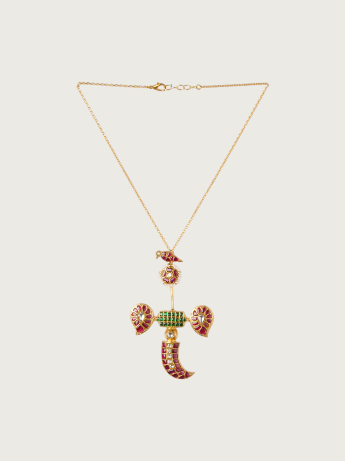 An artistic ode to divine design, this gold-plated necklace features a Trishul-inspired pendant with elements reminiscent of Lord Ganesha. Accented with ruby-hued stones, miniature kundan detailing, and intricate enamel work, the pendant becomes a powerful yet elegant statement piece. The unique silhouette combines traditional symbolism with Tver’s signature handcrafted flair, making it ideal for those who value culture and creativity in their jewelry.