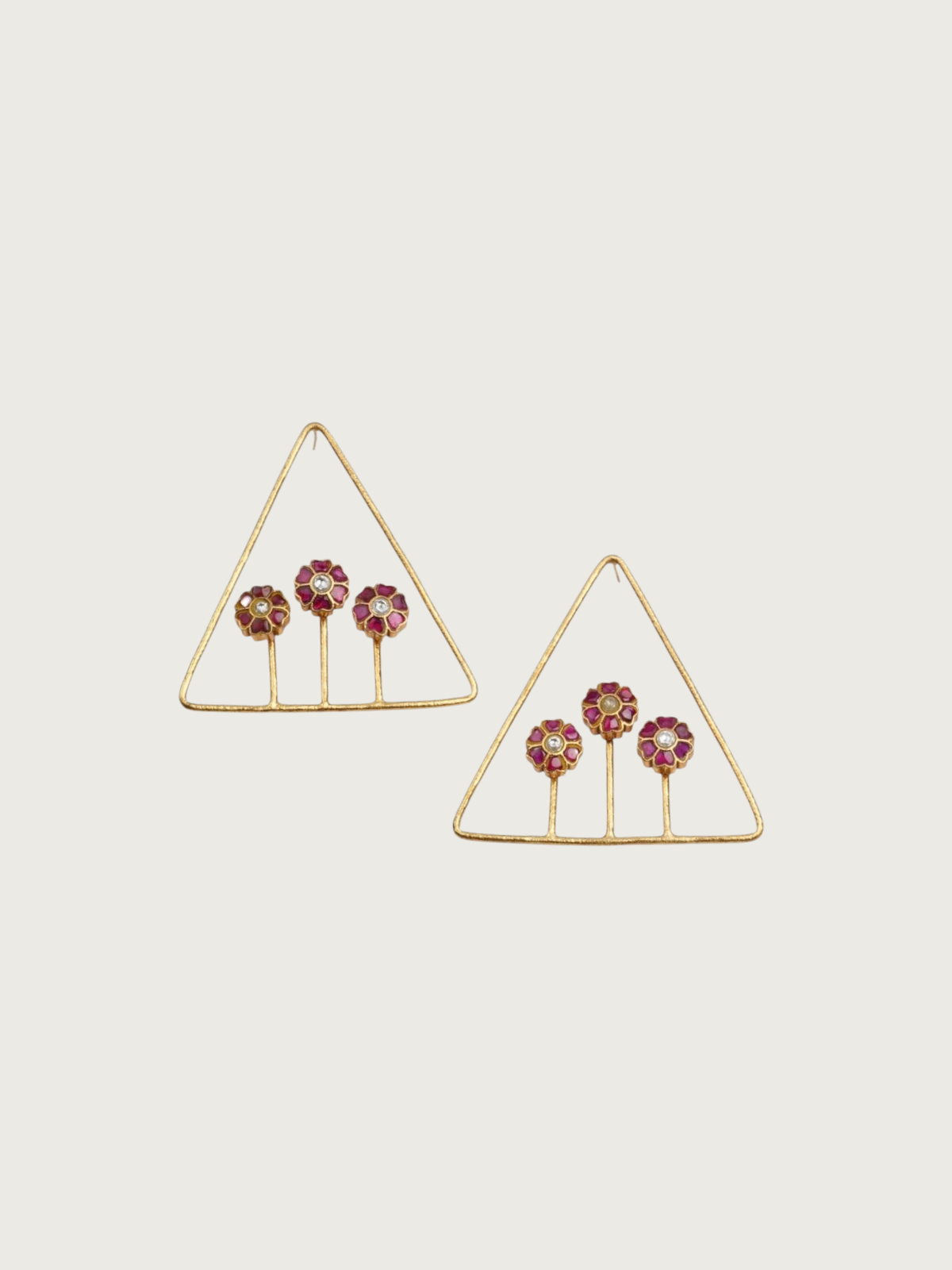 Celebrate symmetry and creativity with these geometric triangle frame earrings from Tver. Crafted in a matte gold-toned finish, these earrings feature an open triangular outline enclosing three petite pink floral elements with delicate kundan work at the center. The floral detailing, rendered in ruby-red enamel with white kundan highlights, evokes a blooming garden scene — balanced artfully within the frame of minimal modernism.