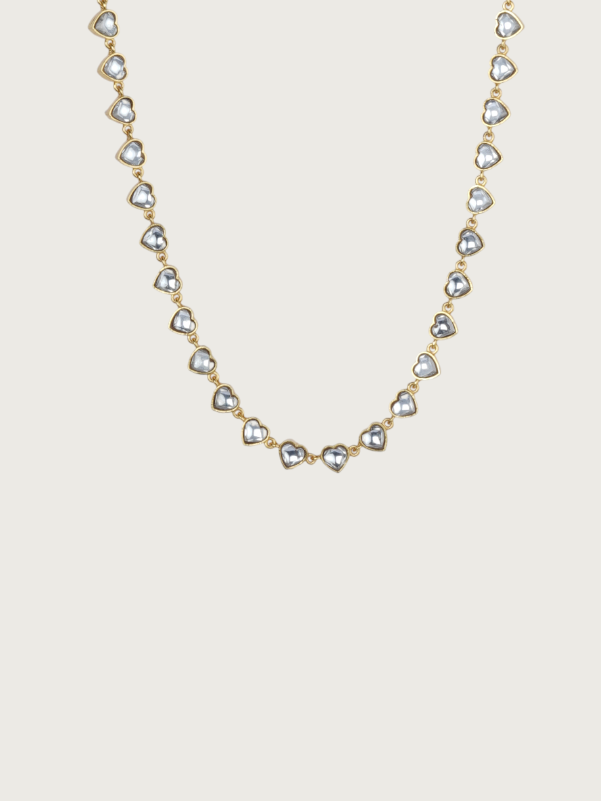 This elegant necklace from Tver features a series of delicate heart-shaped kundan elements, intricately linked to create a graceful chain of sparkle and charm. Each heart frame houses a radiant white kundan stone, set in a gold-plated base that enhances its brilliance. The symmetrical design offers a modern romantic flair, making it a beautiful addition to both traditional and contemporary looks.