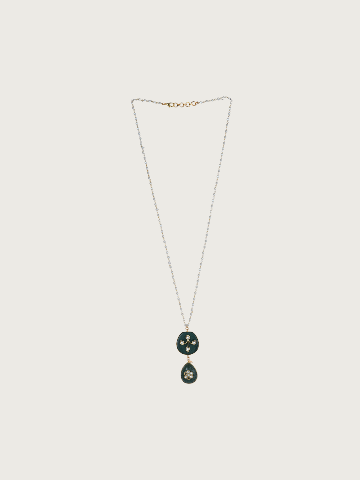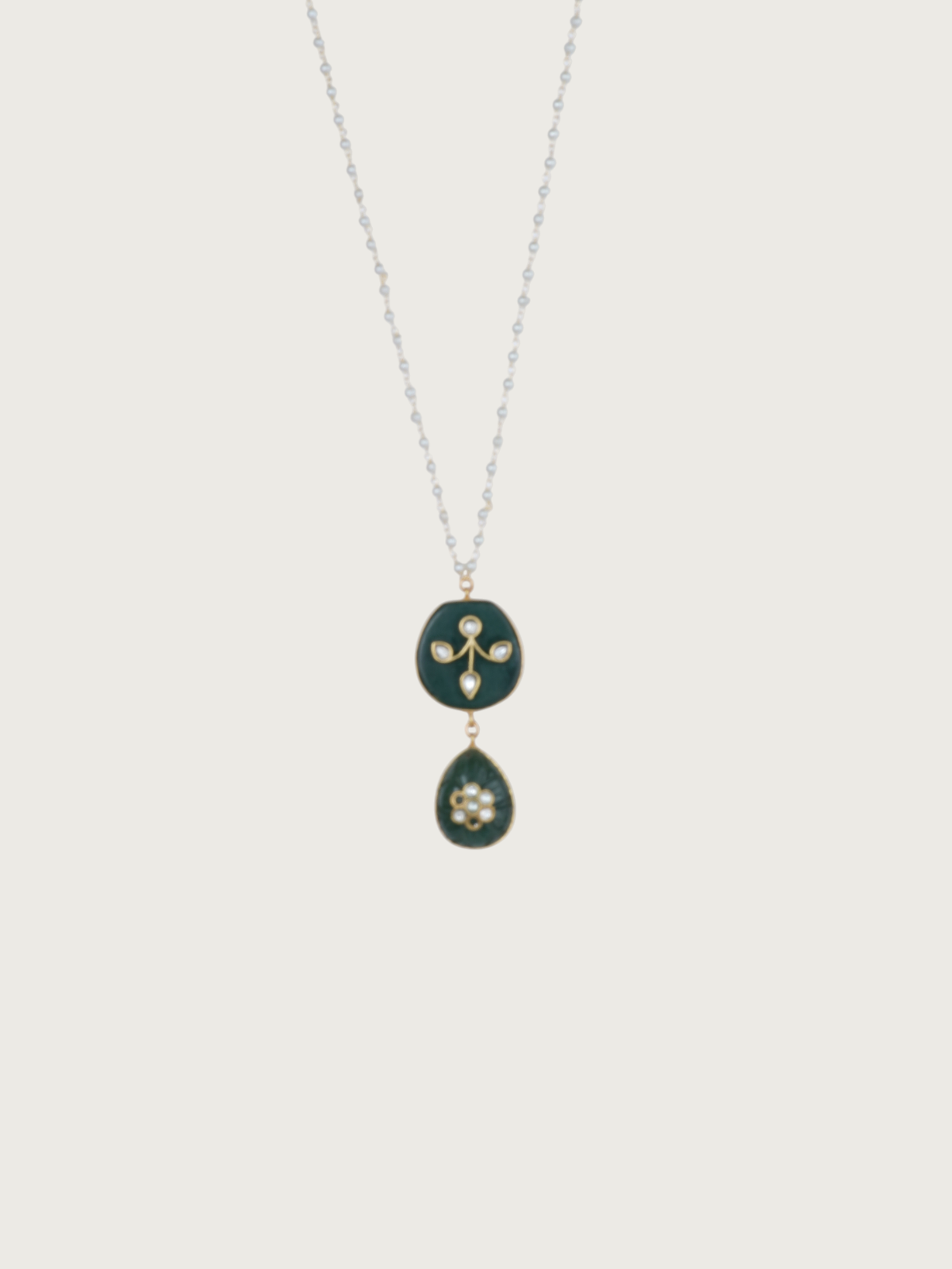 Gracefully handcrafted with a contemporary twist on traditional design, this green necklace features two stunning pendant elements—one rounded and one teardrop-shaped—both adorned with delicate floral and paisley-inspired motifs in a gold-tone finish. The upper pendant showcases a symmetrical three-leaf design with central pearl detailing, while the lower pendant is embellished with a miniature pearl-studded floral motif. Suspended from a dainty pearl beaded chain, the necklace offers refined elegance for those who adore understated charm with a touch of heritage craftsmanship.