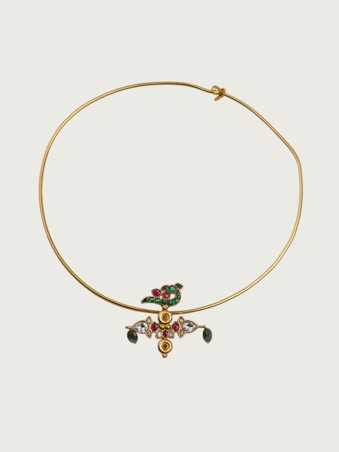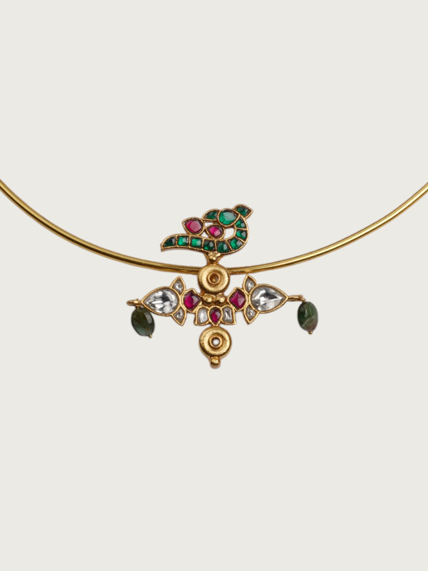 Este collar torque chapado en oro luce un encantador motivo de pájaro adornado con vibrantes detalles de piedra . El elegante y minimalista diseño de alambre le da un toque contemporáneo , mientras que el colorido colgante le aporta un encanto divertido .