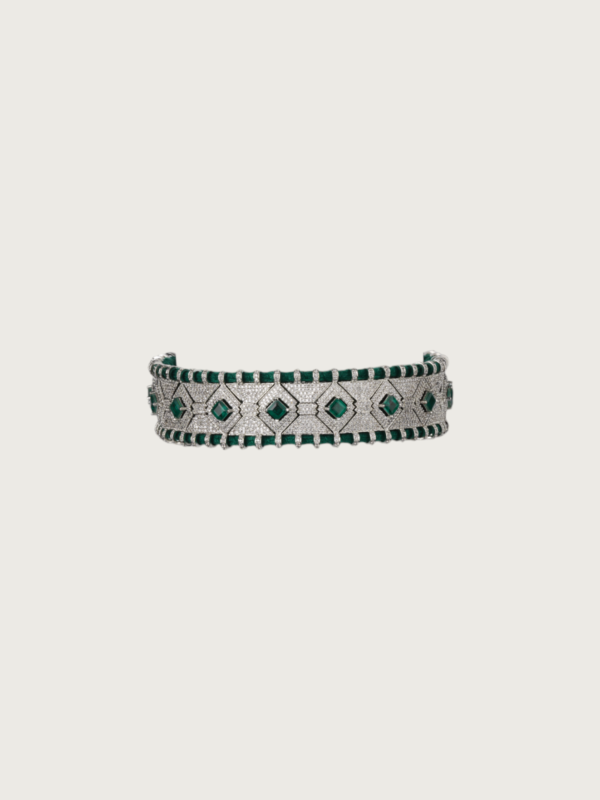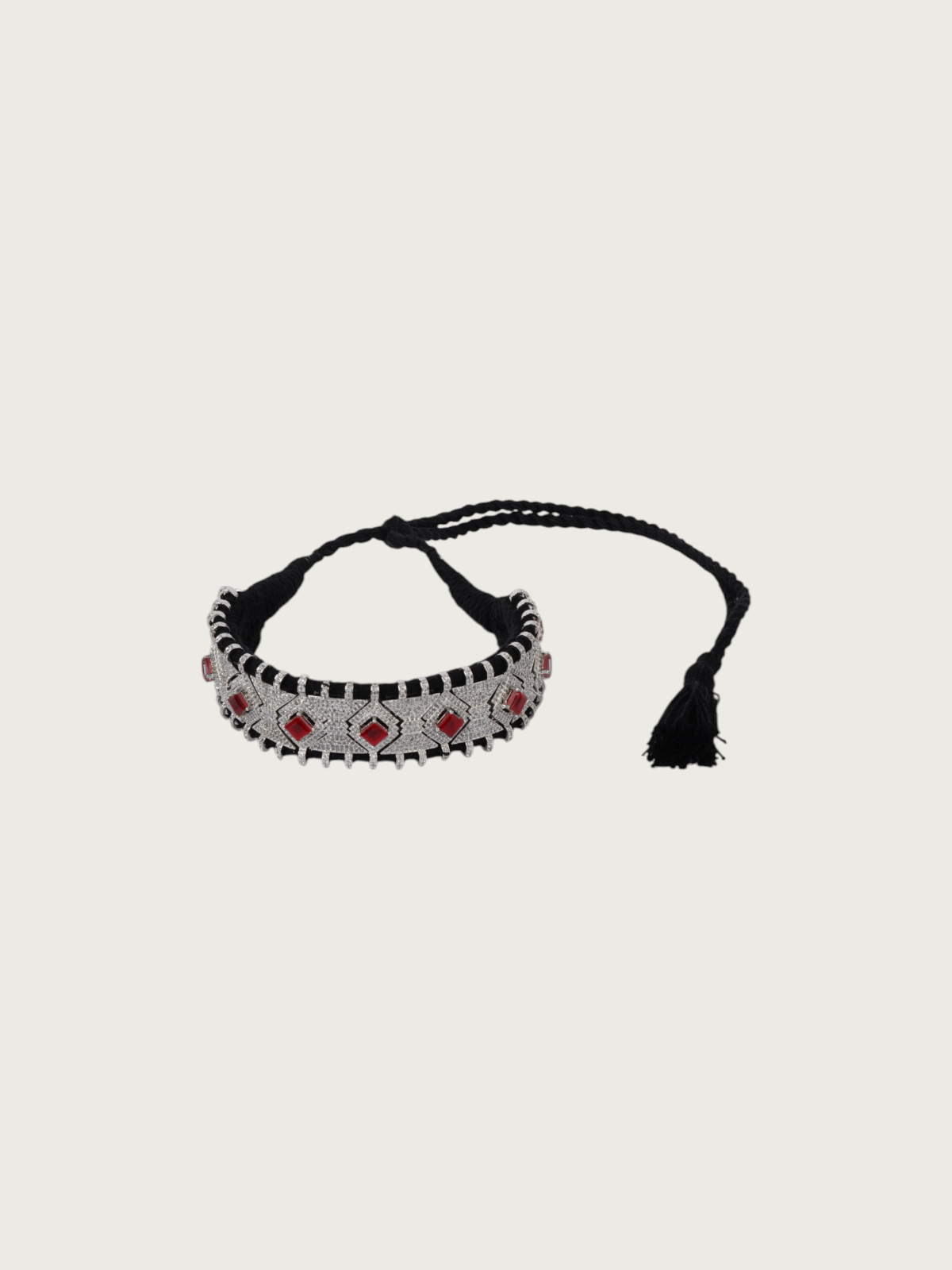 Unleash your bold side with our choker necklace series – a striking play of intricate design, silver finish, and vivid gemstone accents. Handcrafted with precision, these necklaces feature signature Tver styling: geometric pattern work encrusted with delicate CZ stones and highlighted by vibrantly coloured central stones.