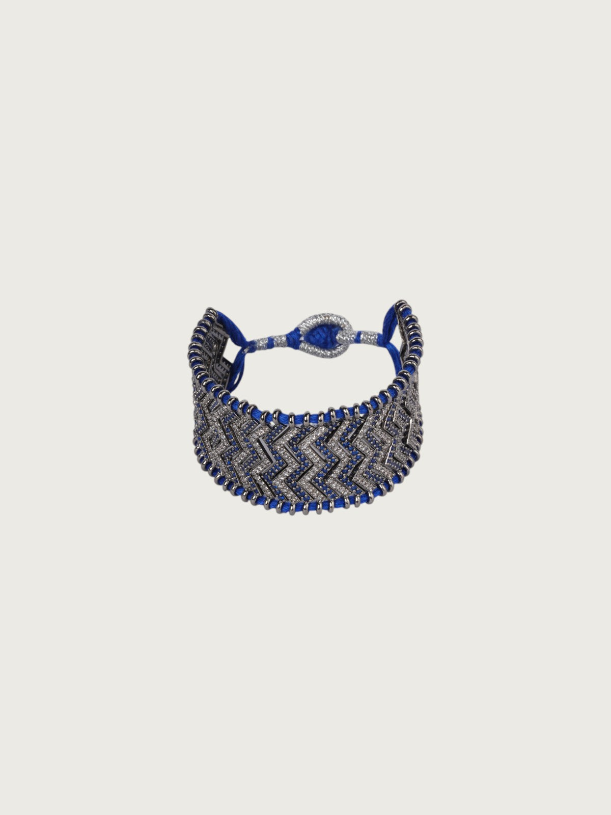 Elevate your wrist game with this bold and modern pair of zigzag CZ bracelets, crafted with meticulous detail and vibrant threadwork. These handcrafted pieces fuse contemporary design with traditional craftsmanship, featuring a dazzling chevron pattern in cubic zirconia. Available in two striking colorways—royal blue and vivid pink—each bracelet is handwoven with colored threads that accentuate the victorian-toned base and give the design a youthful, playful vibe.