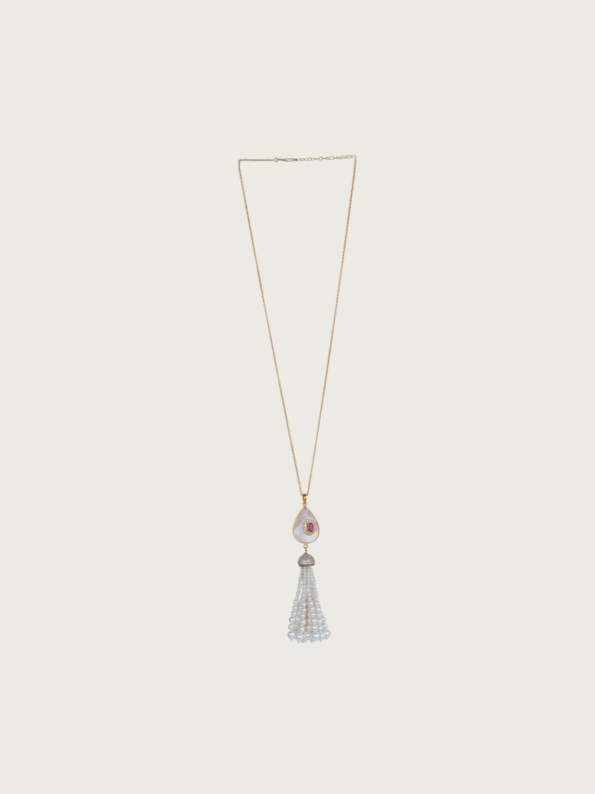 This graceful necklace captures timeless beauty with a modern twist. Featuring a teardrop-shaped kundan stone inlay with a delicate pink floral accent at the center, this piece exudes understated luxury. The pendant gracefully suspends a dome-shaped cap from which multiple strands of lustrous pearls cascade in a tassel form, adding fluidity and charm to the design.