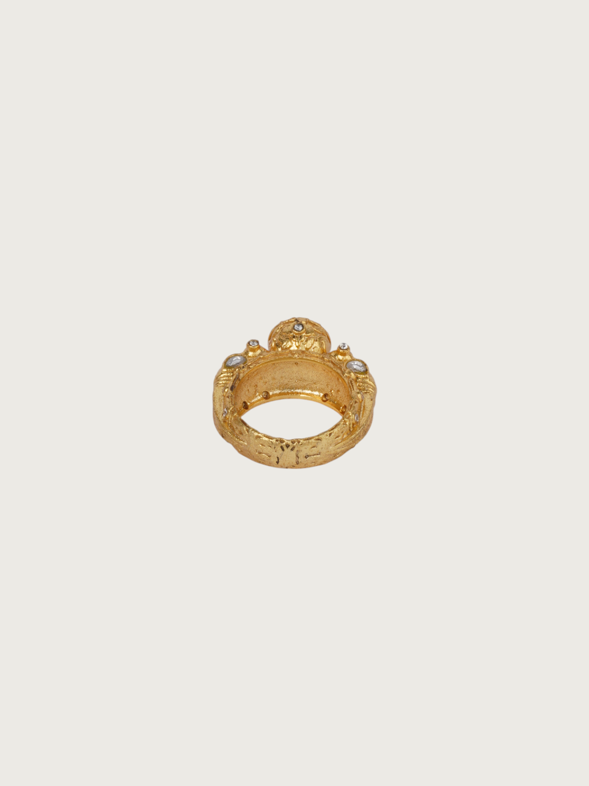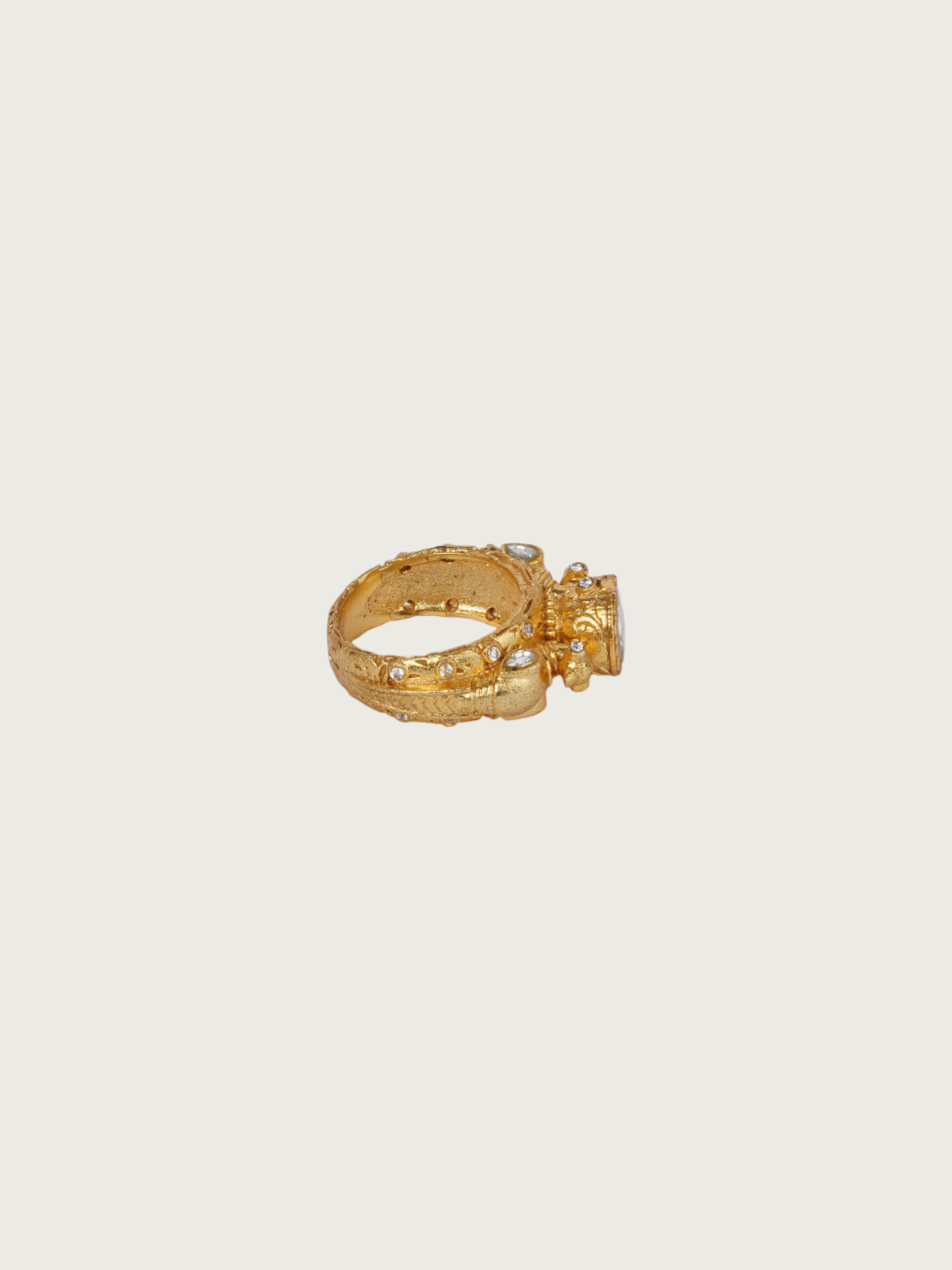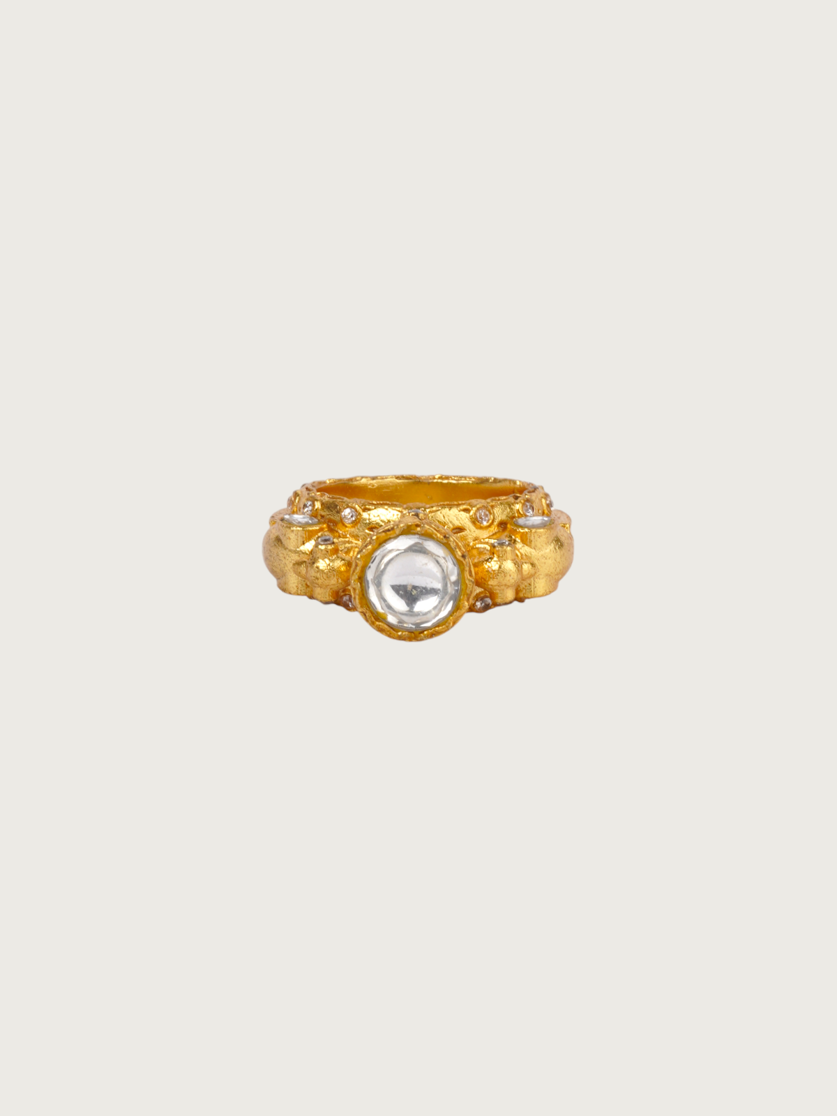 Make a striking statement with this handcrafted gold-plated ring featuring a brilliant white kundan centerpiece. The band is richly textured with artistic granulation work and raised detailing, evoking the charm of vintage Indian craftsmanship. The symmetrical floral-inspired design around the central kundan adds depth, while the subtle antique finish enhances the regal character of this piece.