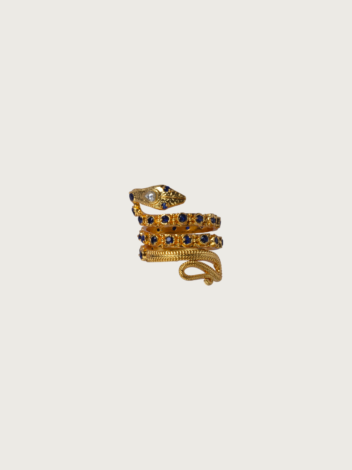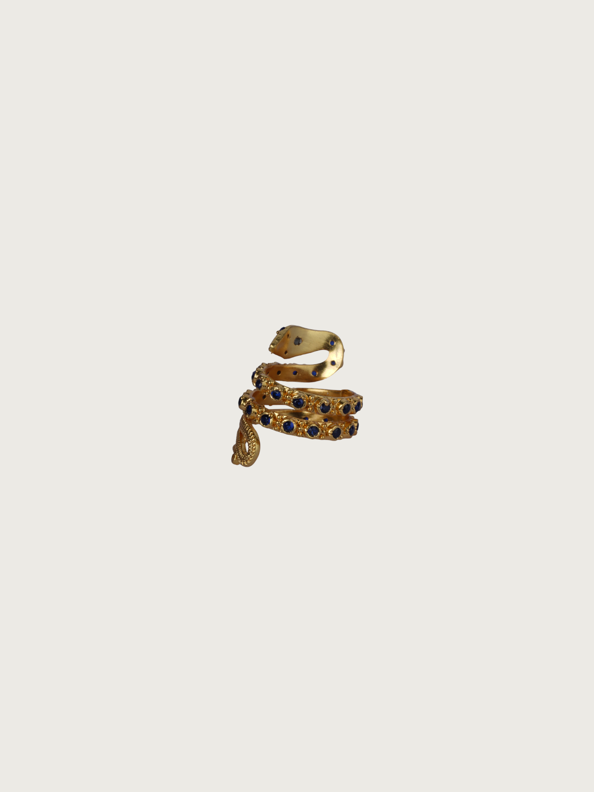 Turn heads with this striking gold-plated snake ring that wraps around your finger in a bold spiral. Encrusted with deep blue sparkling stones, the design mimics the elegant curves and textures of a serpent. Its coiled shape adds a dramatic flair, while the detailed pattern work brings it to life.