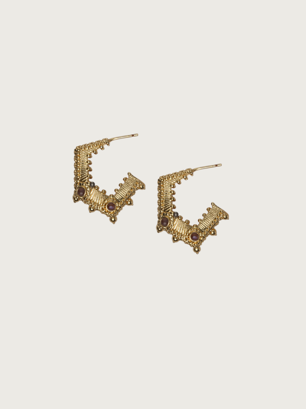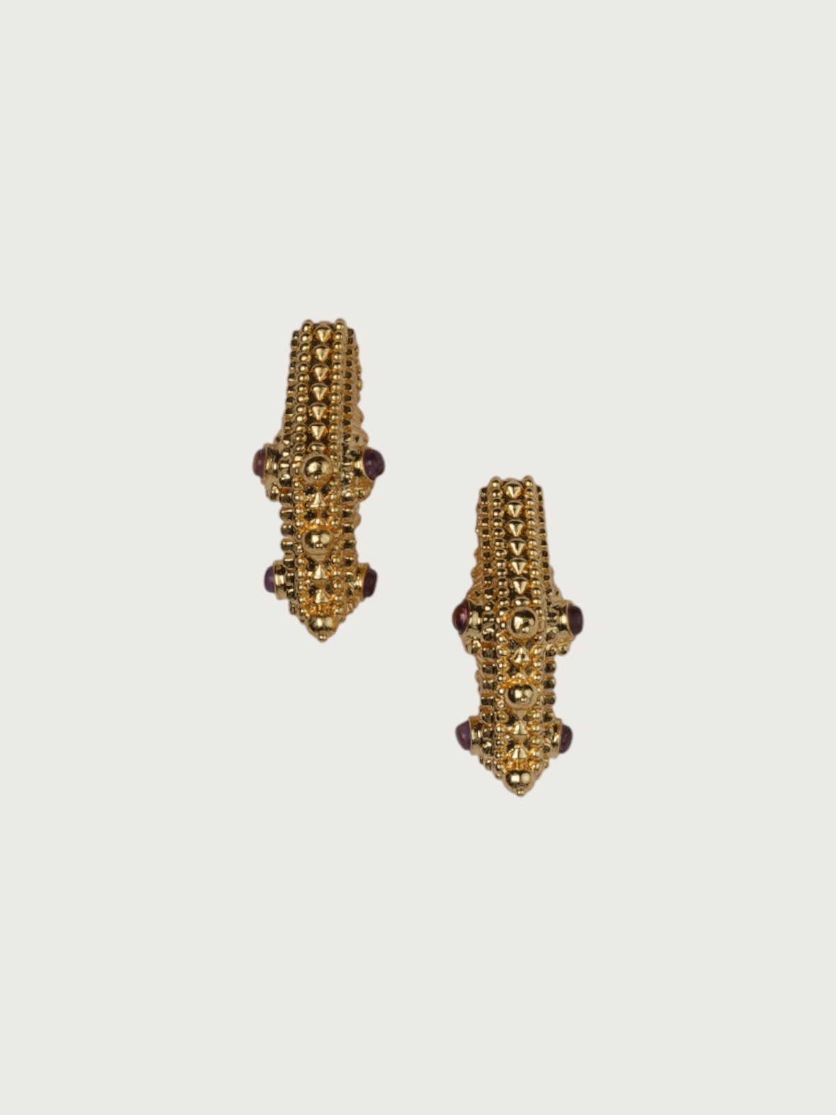 Infuse your style with these bold hoop earrings, handcrafted with intricate beaded textures and vibrant accents. Inspired by ancient ethnic artistry, these gold-plated hoops showcase a fusion of sharp geometric shapes, dome-like textures, and granulated motifs that lend a distinct handcrafted character to every pair.