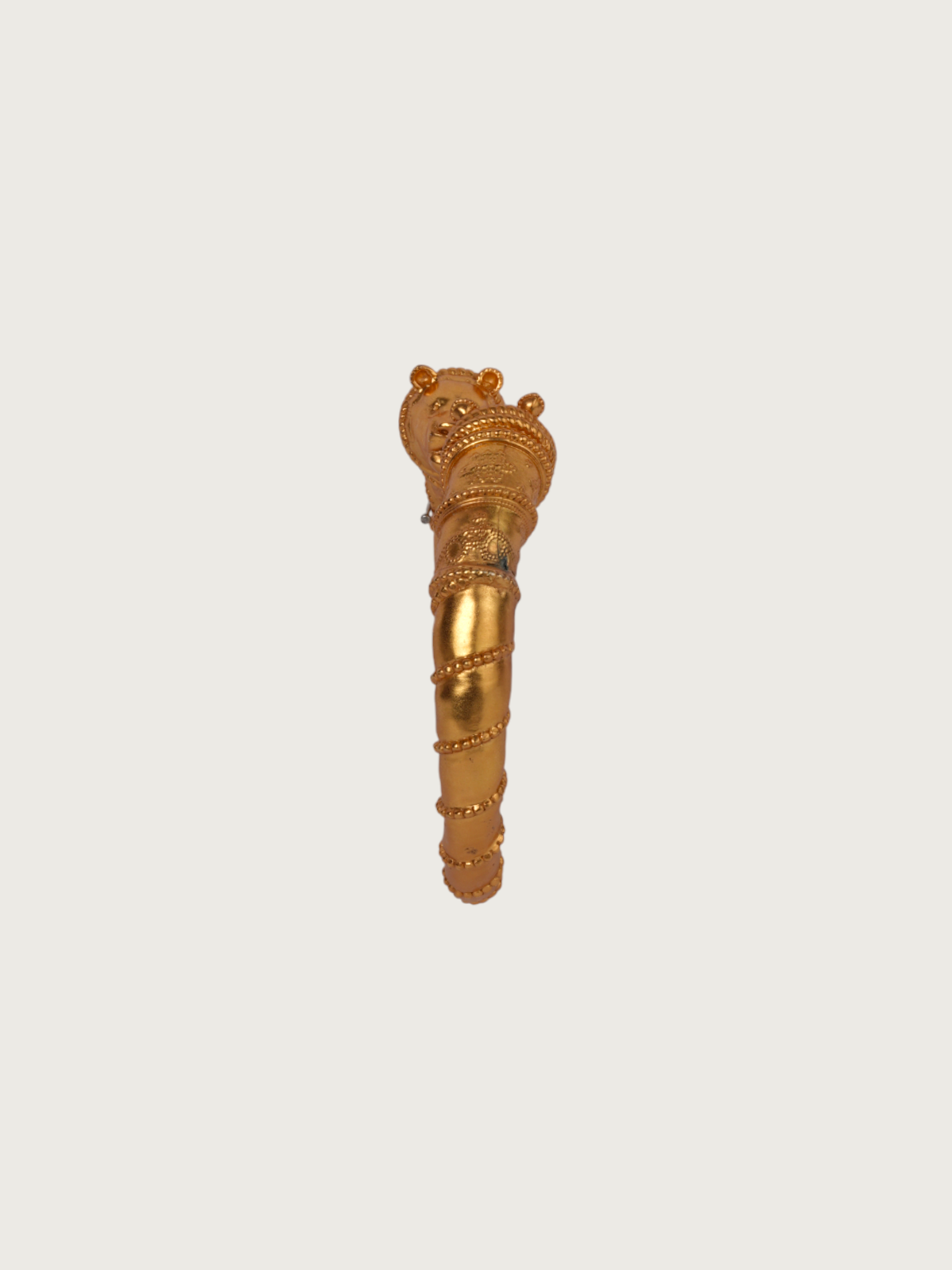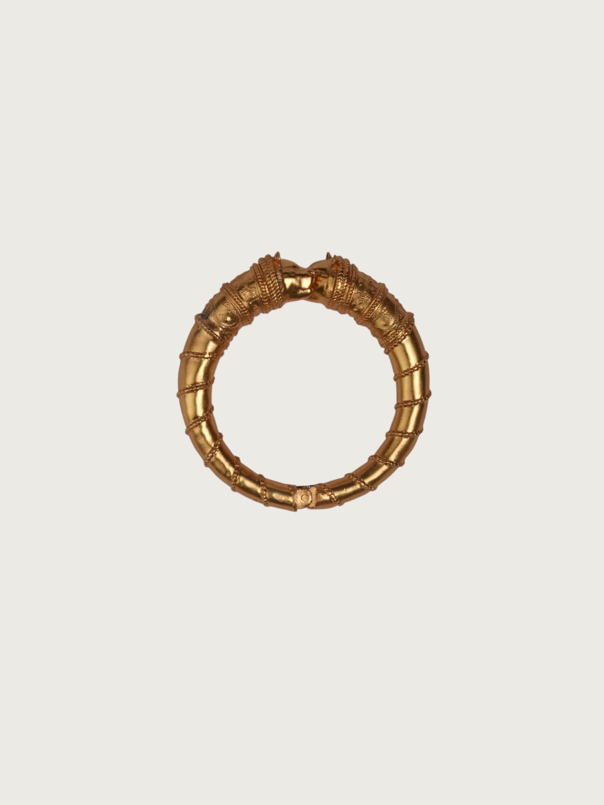 This Tver gold-plated hinged bangle is a stunning sculptural piece that embodies timeless craftsmanship and heritage-inspired artistry. The design features intricate engraving, layered textures, and rounded accents that flow seamlessly around the bangle, creating a rhythm of ornate detailing and bold form.