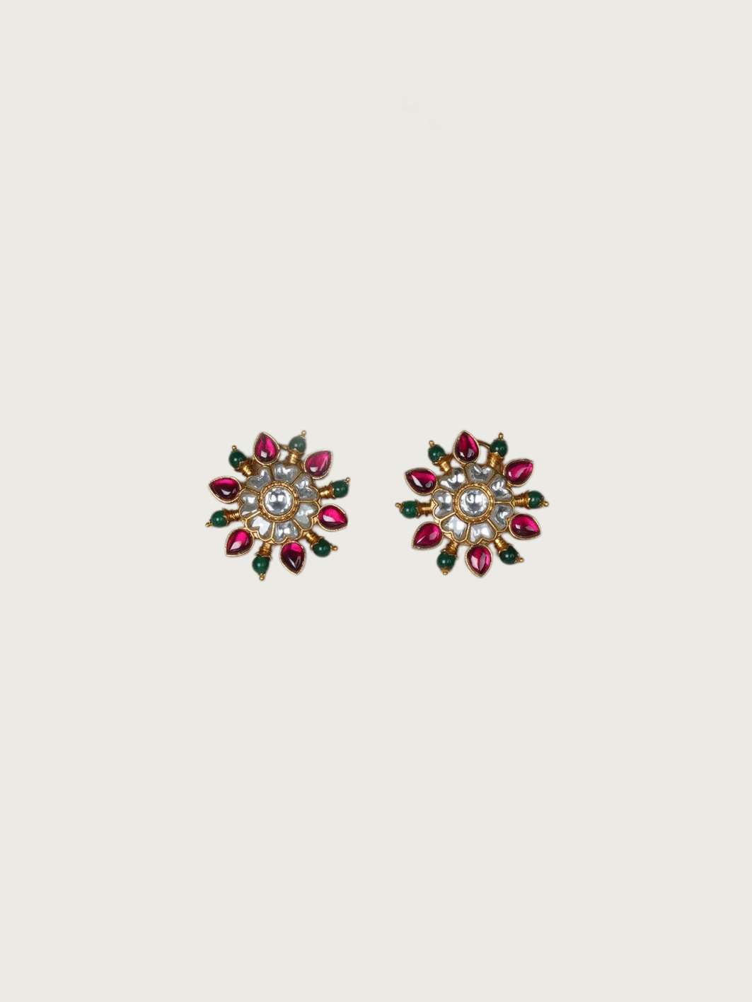 Les boucles d'oreilles Royal Lotus de Tver arborent un motif floral inspiré de l'art moghol. Fabriquées à la main en laiton plaqué or, ces boucles d'oreilles arborent de délicats accents rouges et verts qui reflètent l'héritage indien intemporel avec une touche minimaliste et élégante.