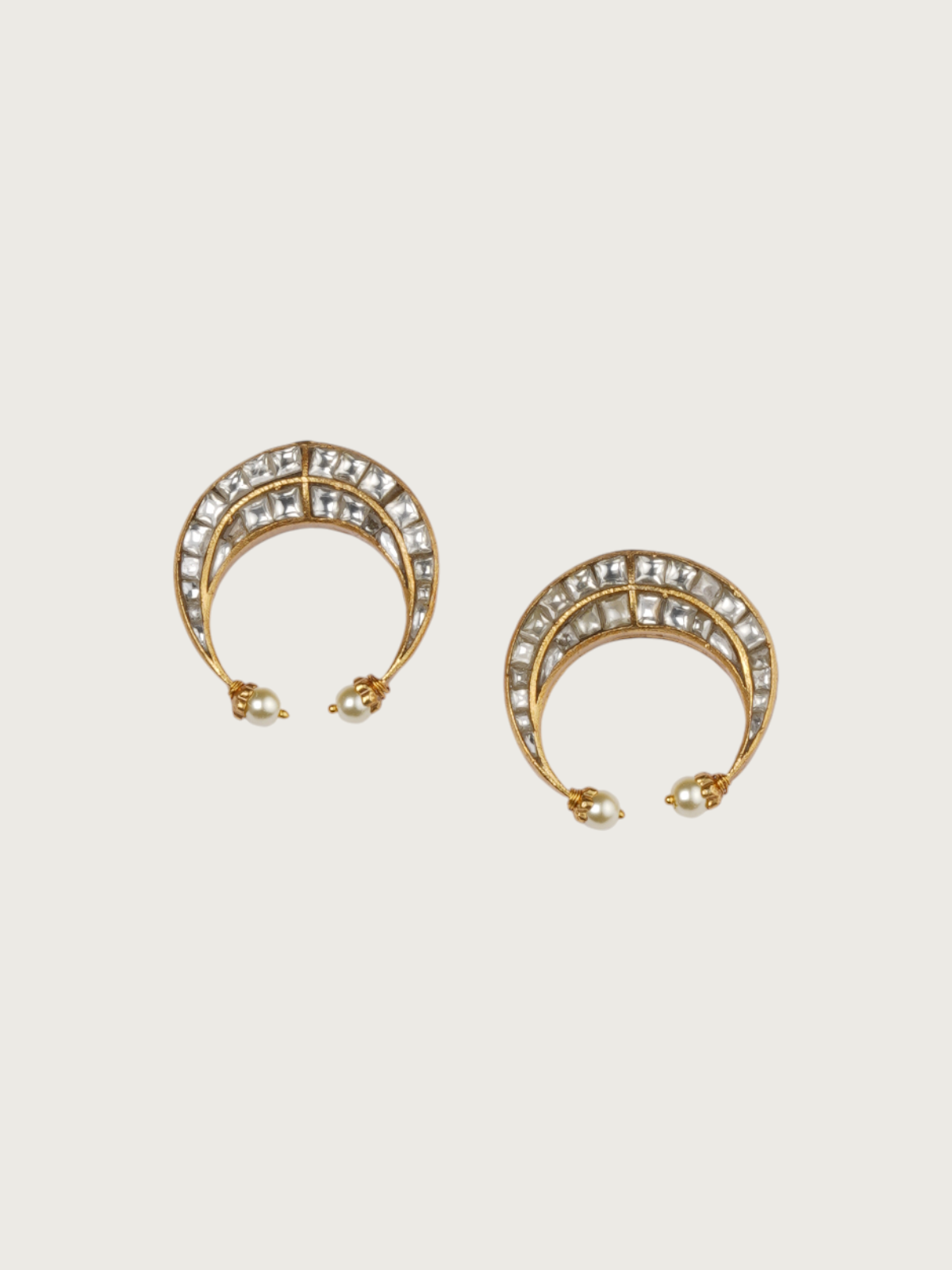 A refined pair of crescent-shaped earrings handcrafted in gold plating and embellished with delicate crystal detailing. Each arc is beautifully balanced with a luminous pearl drop at its end, adding a hint of charm to the structured silhouette.