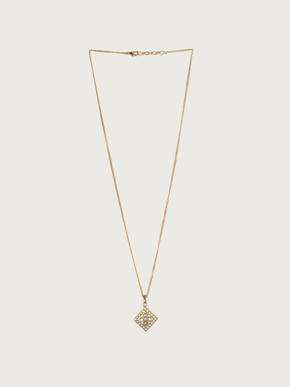 Minimal yet striking, this gold-plated necklace features a square pendant. Embedded with glistening white stones, the pendant is paired with a delicate beaded chain that balances elegance with everyday versatility. The handcrafted detailing and symmetrical design lend this piece a contemporary charm while retaining a traditional touch.