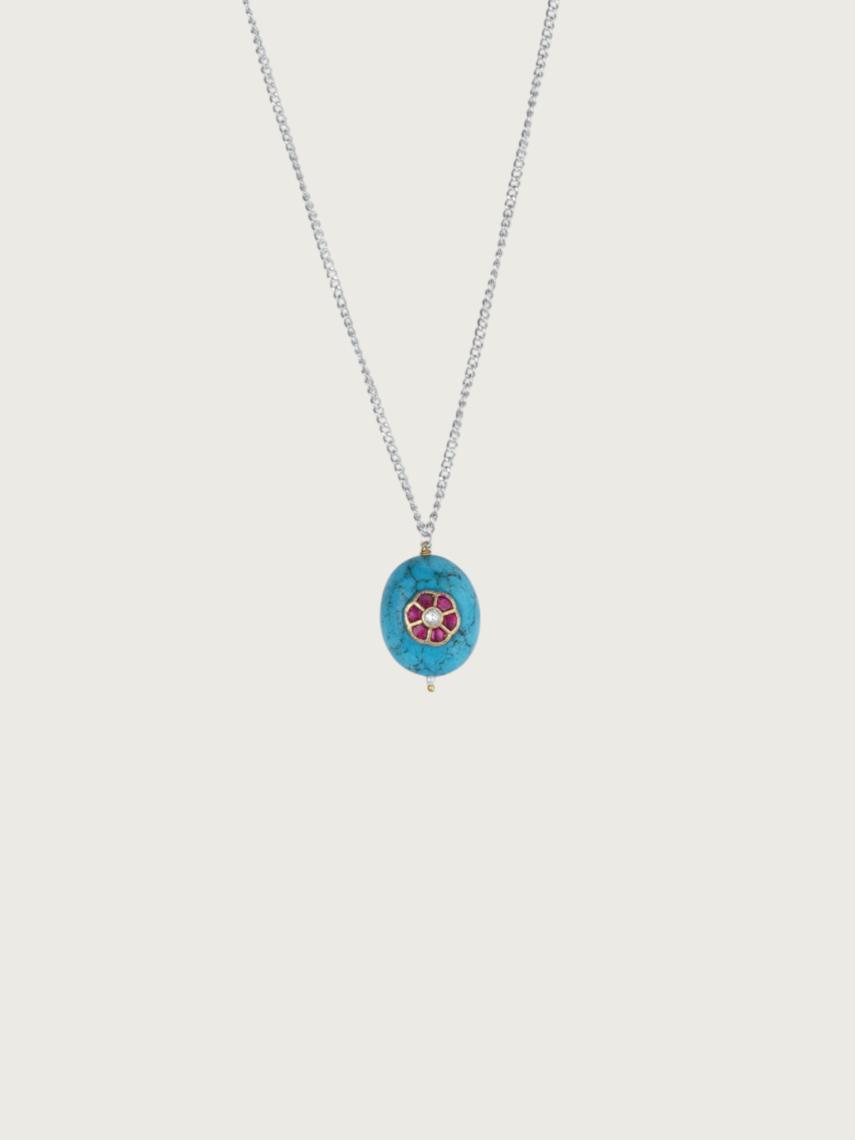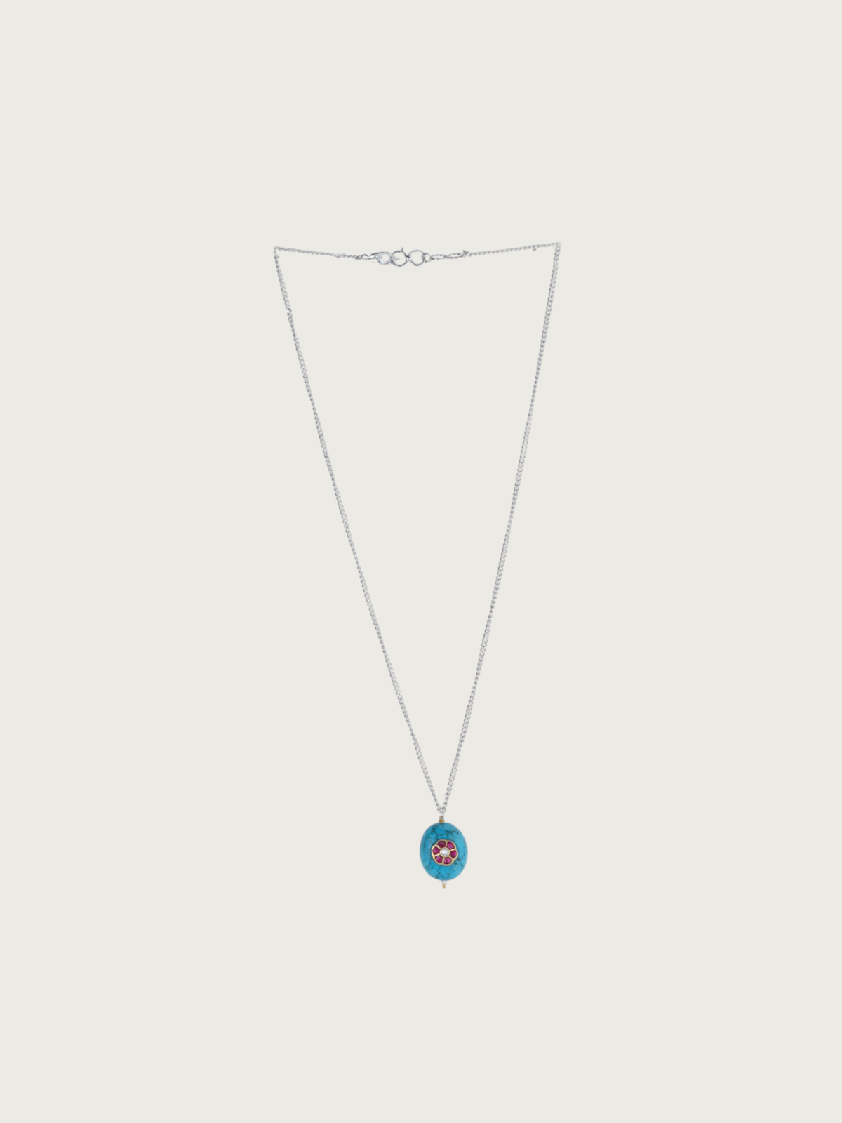 Add a touch of traditional charm with this handcrafted sky blue round pendant necklace featuring a delicate floral motif in classic kundan work. Suspended from a minimalist silver-toned chain, this piece merges folk artistry with a contemporary silhouette. The intricately carved circular pendant is adorned with a central floral design in pink and gold tones, making it a vibrant yet versatile accessory.