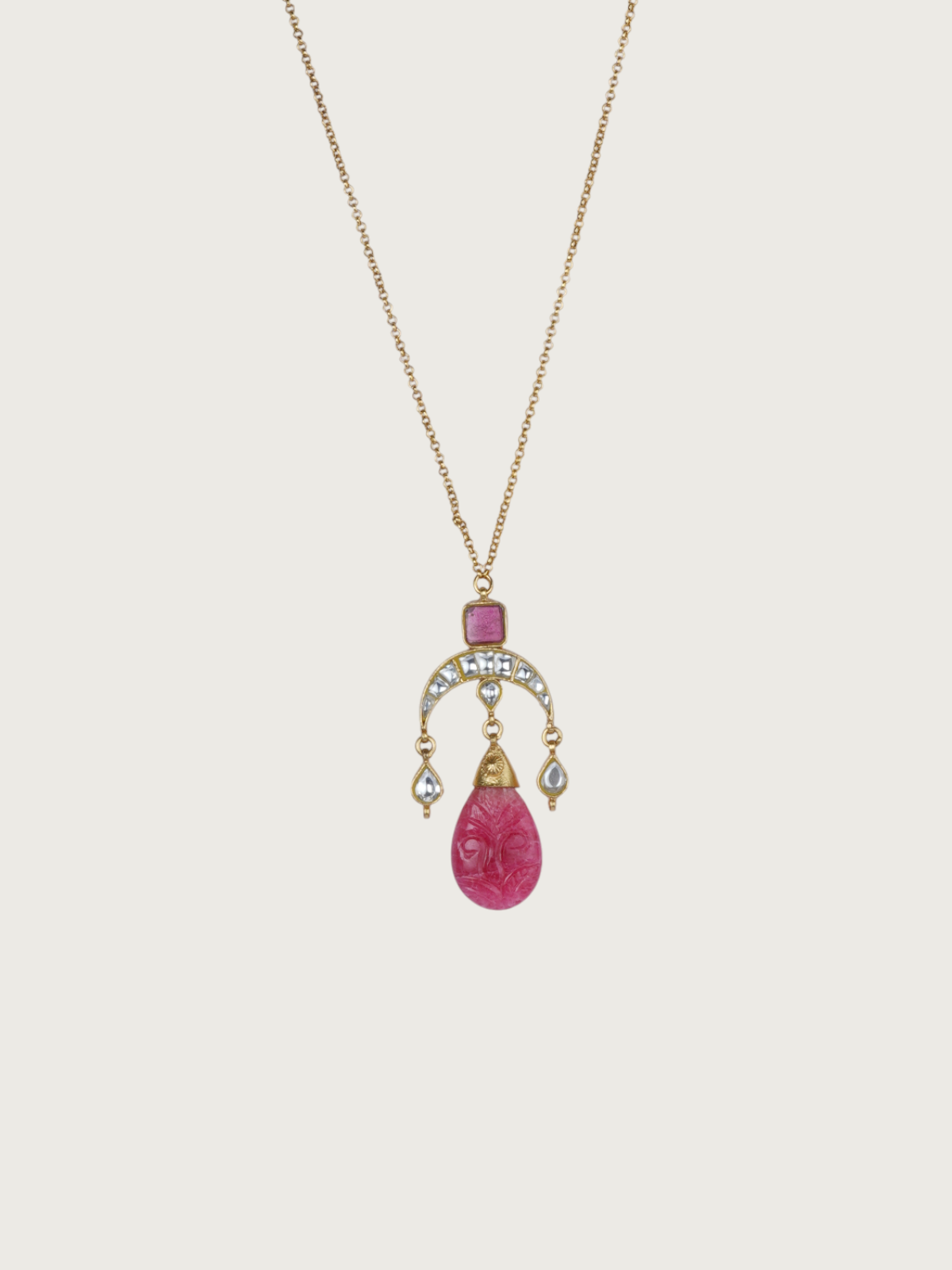 Inspiré par la splendeur des bijoux moghols et royaux indiens, ce collier pendentif sculpté allie l'élégance traditionnelle à une forme minimaliste et accessible. Orné de sculptures complexes et de délicats ornements, il est suspendu à une fine chaîne plaquée or, alliant tradition et modernité. Une pièce intemporelle pour les amateurs d'artisanat classique.