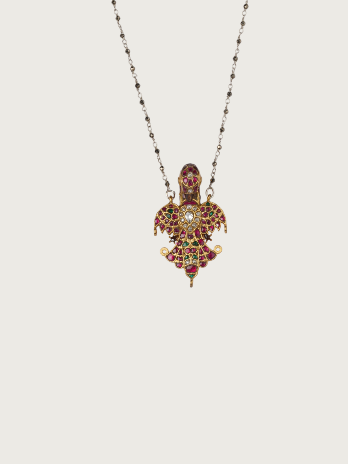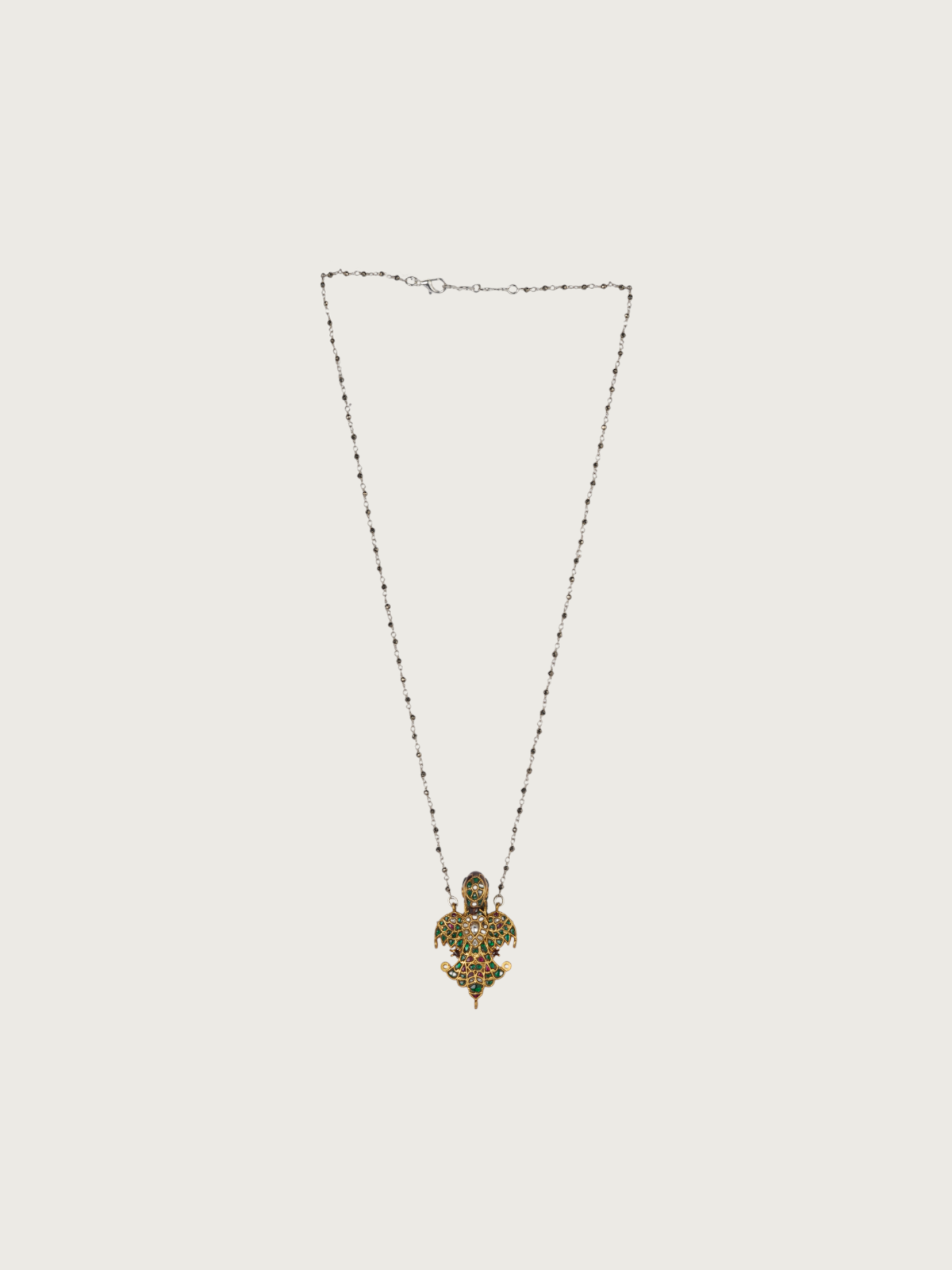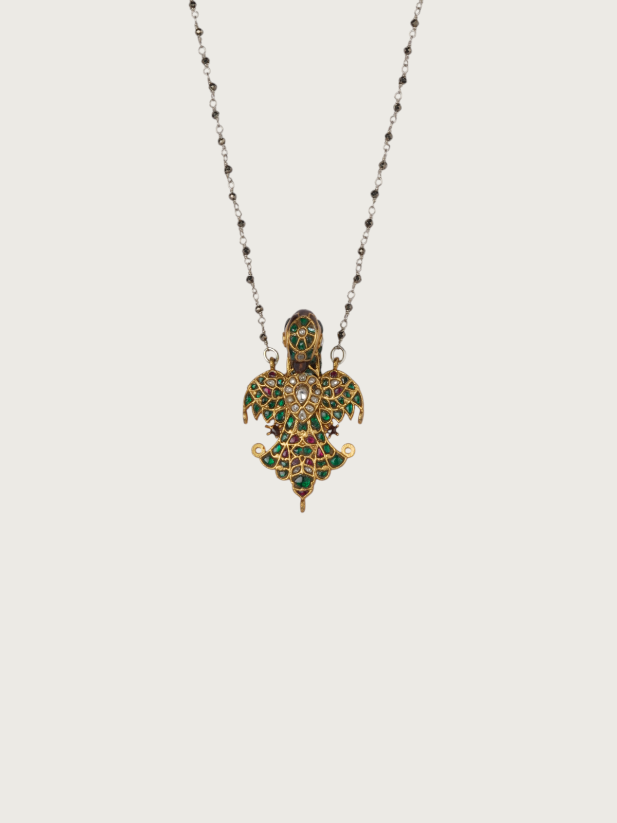 An artistic expression of folklore and tradition, this pendant necklace showcases a beautifully detailed parrot motif in classic style. The pendant are in vibrant colors in green and pink —adorned with intricate kundan-style accents that catch the light with every movement.