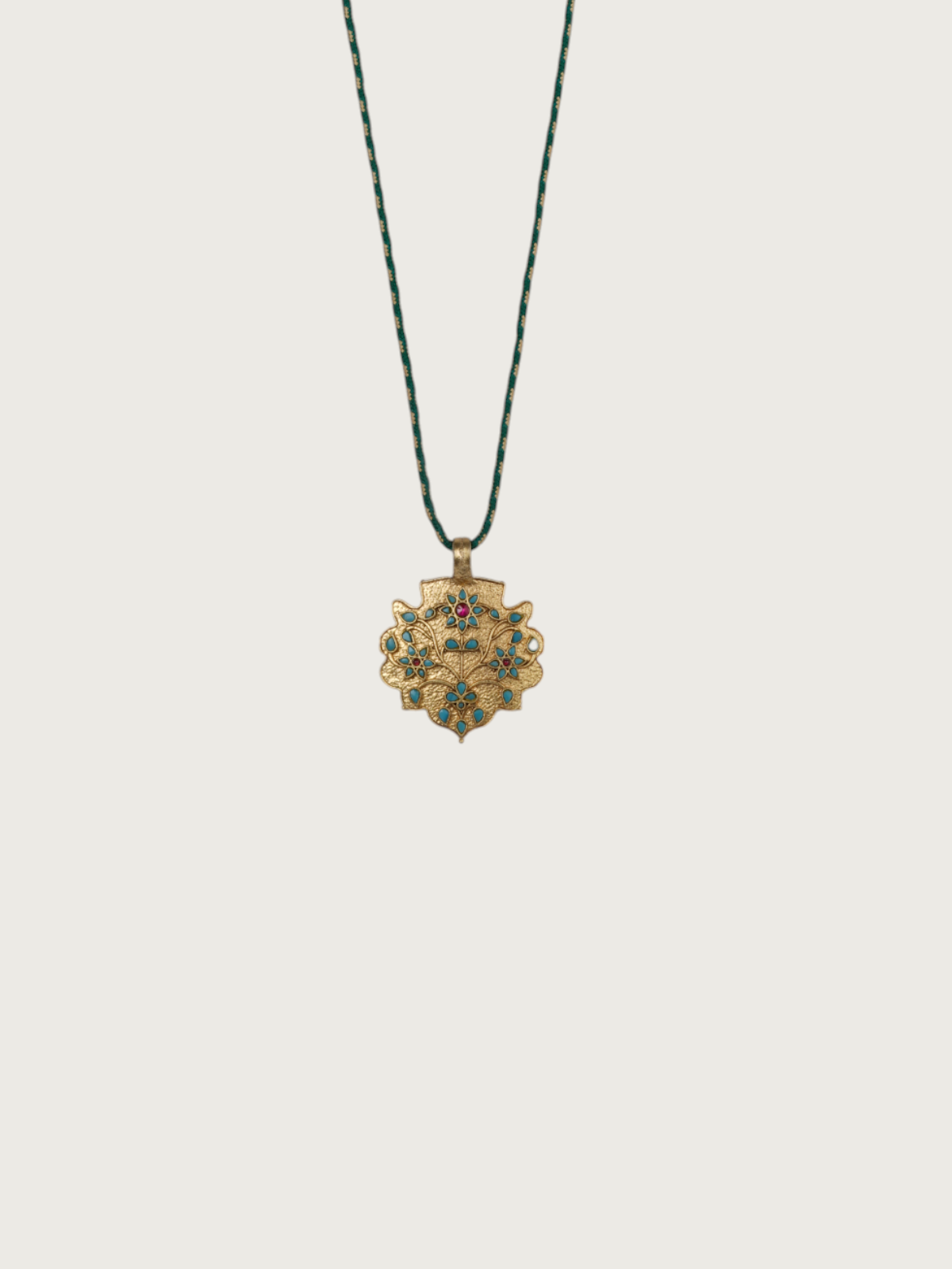 Ce collier pendentif plaqué or présente un délicat motif floral aux accents bleu vif . Son savoir-faire raffiné en fait un accessoire polyvalent qui s'adapte à toutes les tenues.