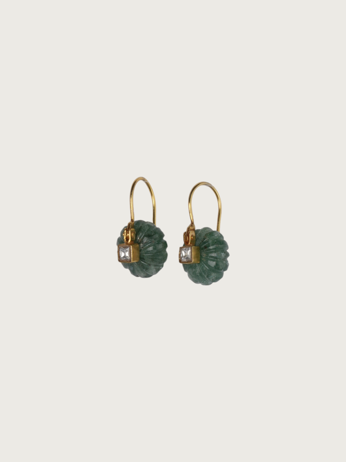 A contemporary design with a handcrafted touch, these gold-plated earrings feature carved green circular drops paired with square white accents. The clean symmetry and textured detailing create a balanced blend of elegance and modern craftsmanship.