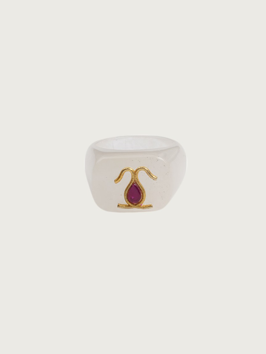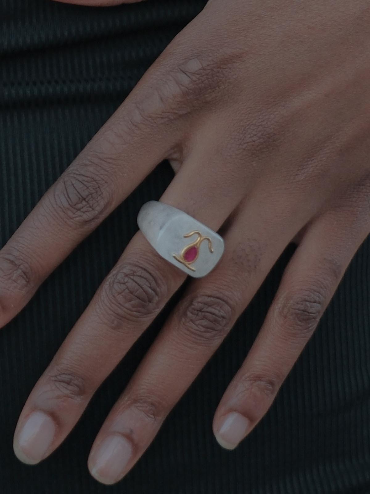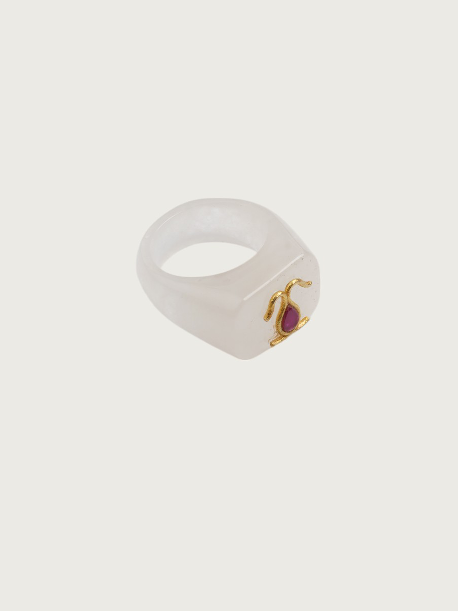 Sublimez votre collection de bijoux avec cette bague en quartz blanc fabriquée à la main , fusion parfaite entre minimalisme et élégance . Conçue dans un style chevalière audacieux , cette bague présente un quartz lisse et translucide rehaussé d'un motif plaqué or et d'une délicate pierre de jadau rose pour une touche raffinée et royale.
