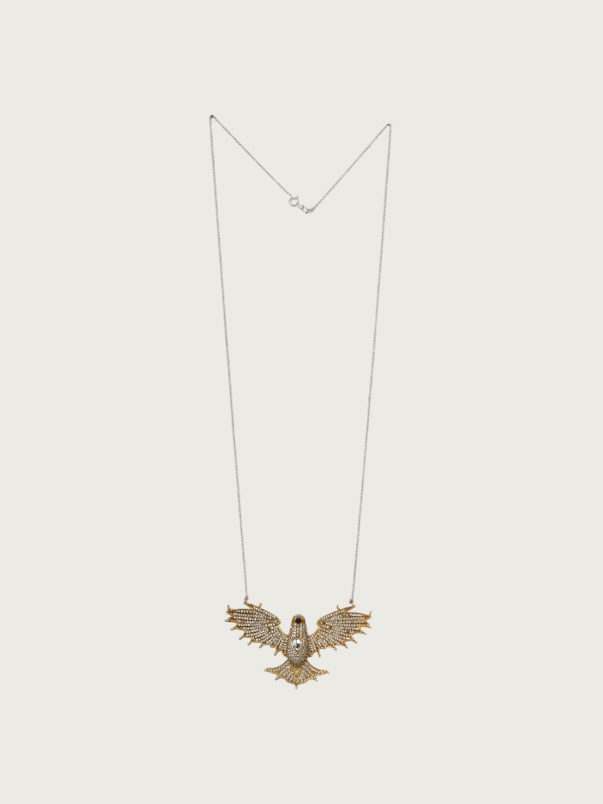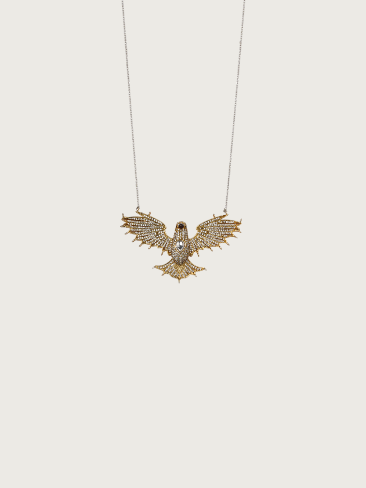 Le collier pendentif majestueux Faucon de Tver capture l'essence même de la puissance et de la grâce. Confectionné en laiton plaqué or, ce pendentif faucon présente des détails complexes et de subtils accents nacrés rappelant les bijoux royaux indiens. La chaîne en argent apporte un contraste moderne, faisant de ce collier une pièce audacieuse inspirée de l'héritage moghol et d'une élégance intemporelle.