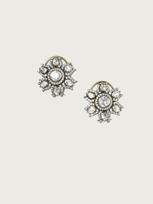 Delicate and timeless, these 925 silver floral cluster earrings are a stunning tribute to traditional design with a modern edge. Intricately arranged in a blooming flower pattern, the central stud is surrounded by petite, shimmering white kundan-style stones, lending an old-world charm to your look. Their compact size makes them perfect for everyday elegance or as a sophisticated accent to heavier ensembles.