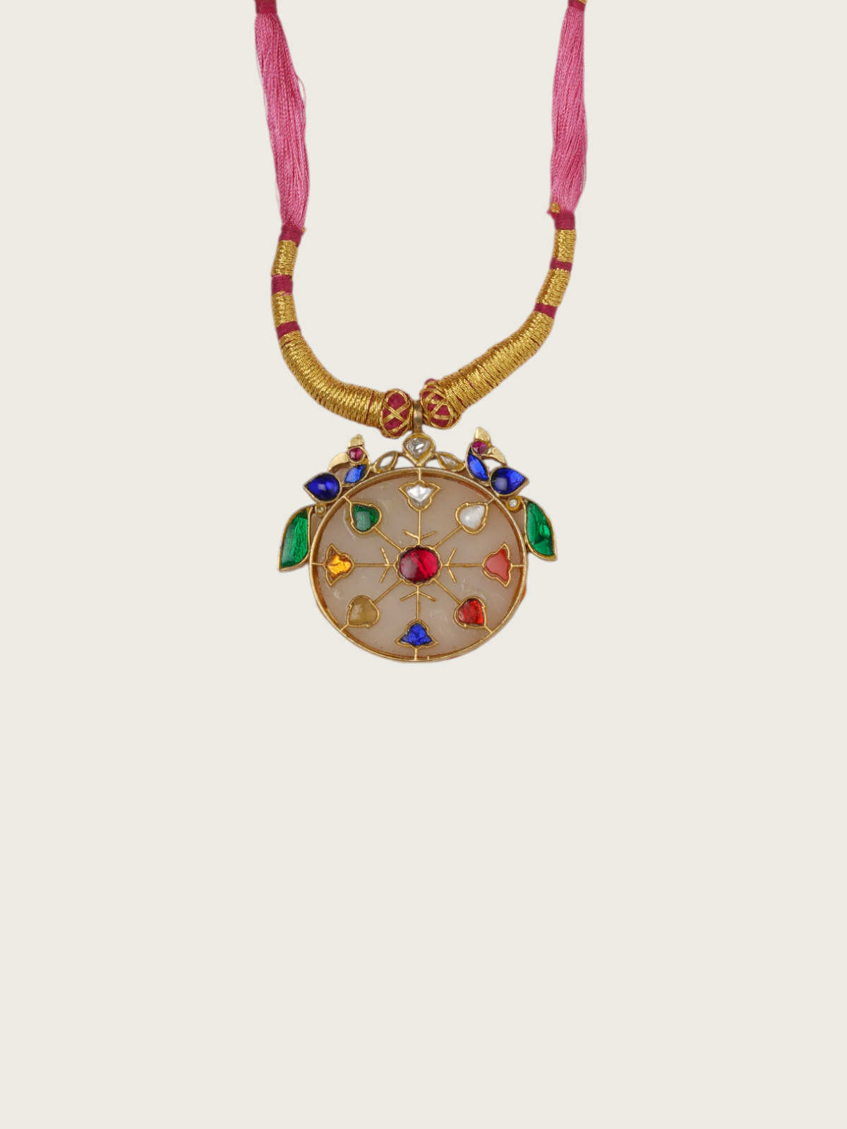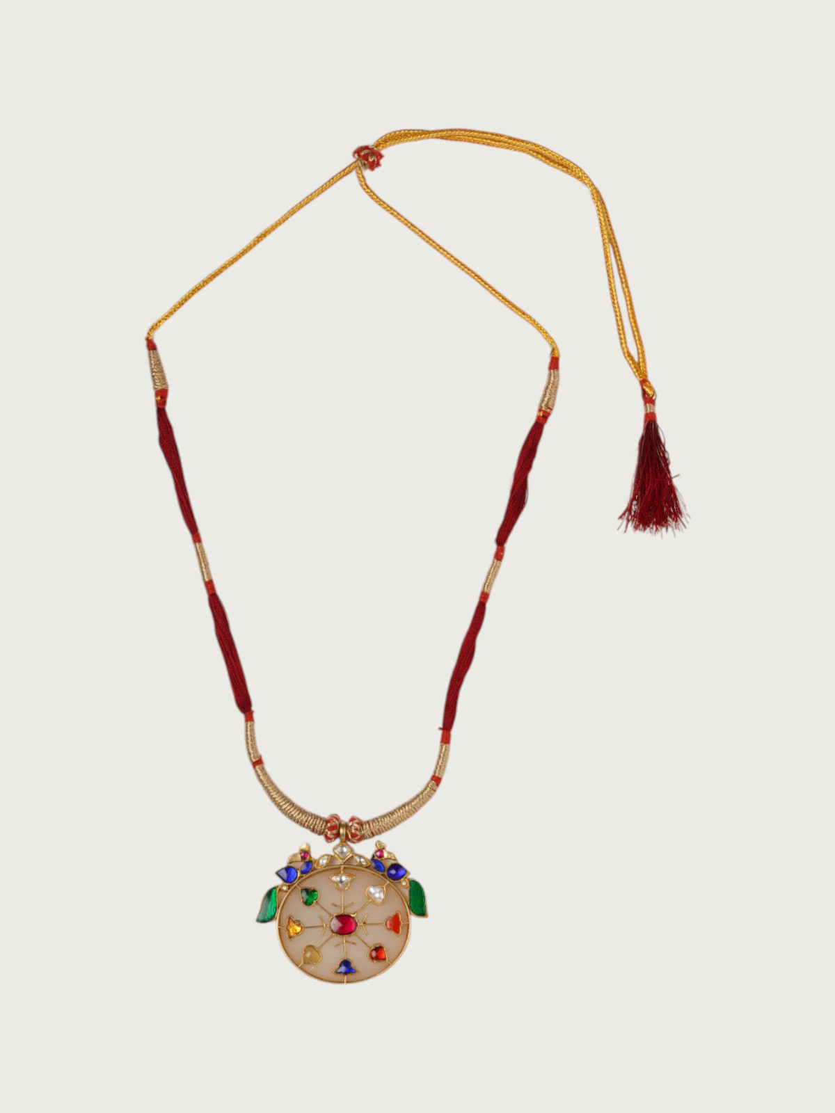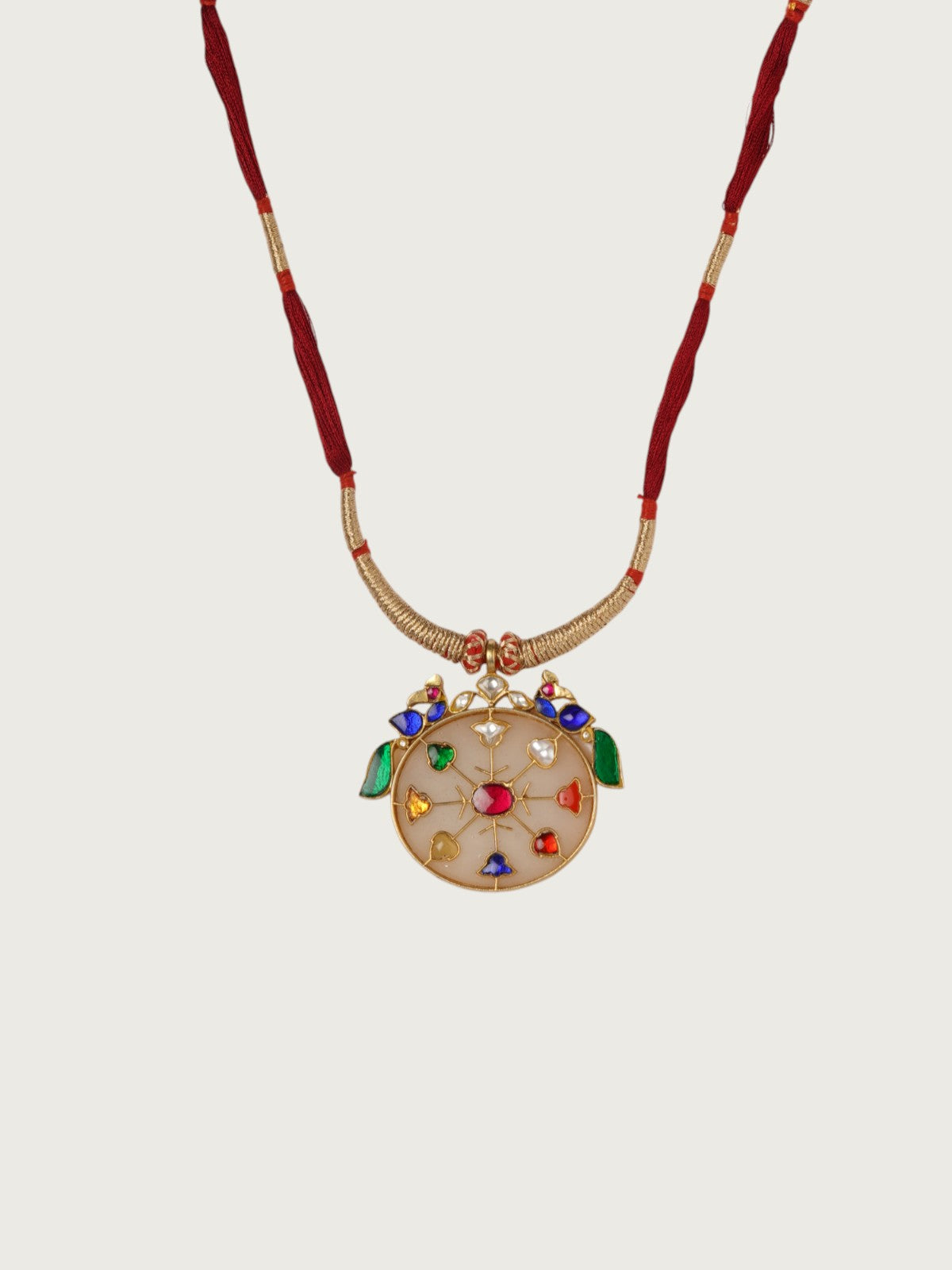 Inspired by the timeless symbolism of the Navratna, this handcrafted pendant necklace features a radiant disc adorned with nine vibrant stones inlaid in kundan-style settings.
