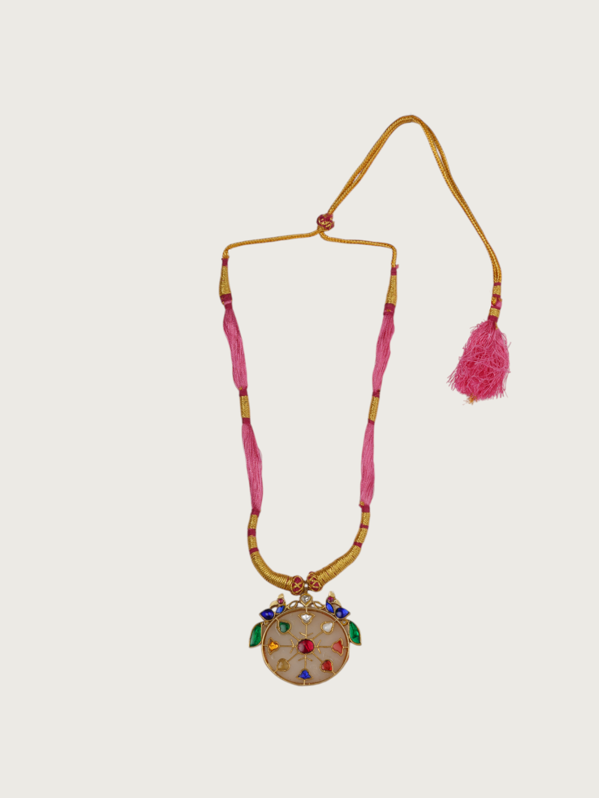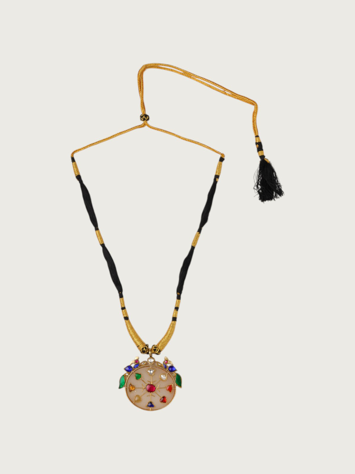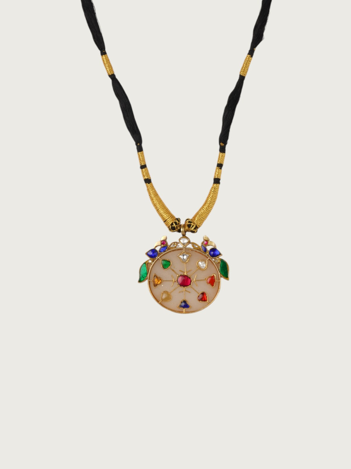 Inspired by the timeless symbolism of the Navratna, this handcrafted pendant necklace features a radiant disc adorned with nine vibrant stones inlaid in kundan-style settings.