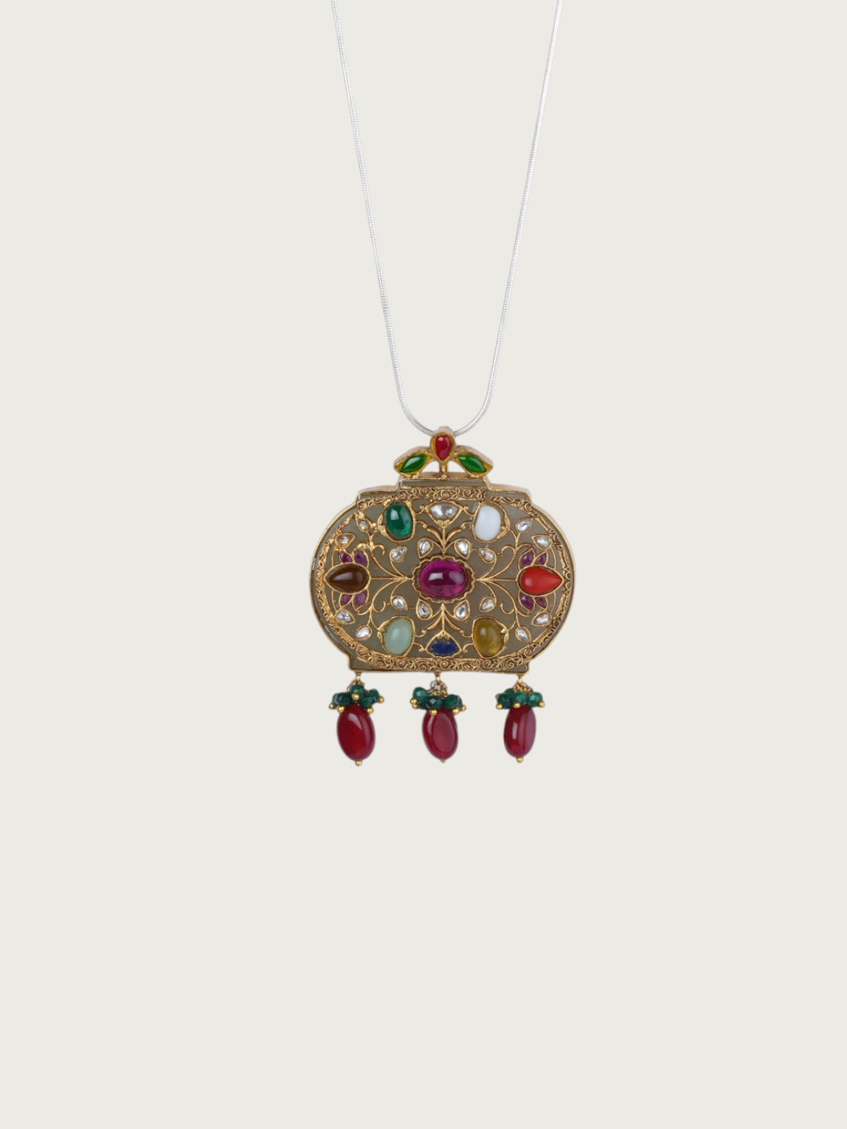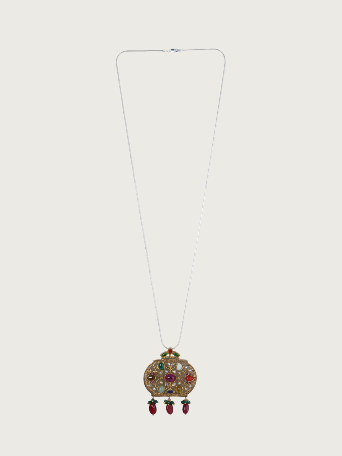 This elegant long necklace features an intricately crafted oval pendant adorned with multicolour kundan work, accentuated by red, white, and green stone inlays. The hanging red beads at the base of the pendant add movement and charm, while the delicate pearl string and emerald-green bead accents elevate the design with a regal finish. This piece is a beautiful blend of traditional detail and timeless styling—perfect for layering or wearing as a standout statement on its own.