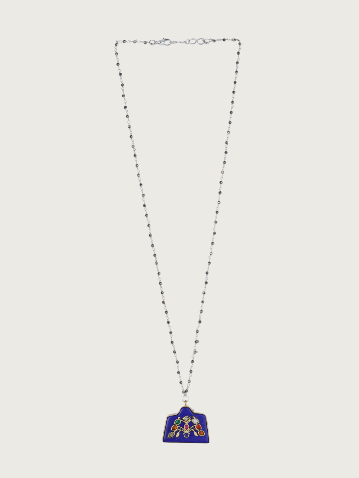 A striking piece of art and tradition, this pendant necklace features a royal blue enamel base adorned with vibrant hand-painted floral motifs in multicolored tones. The pendant hangs gracefully from a silver-toned beaded chain, blending intricate enamel artistry with a contemporary silhouette.