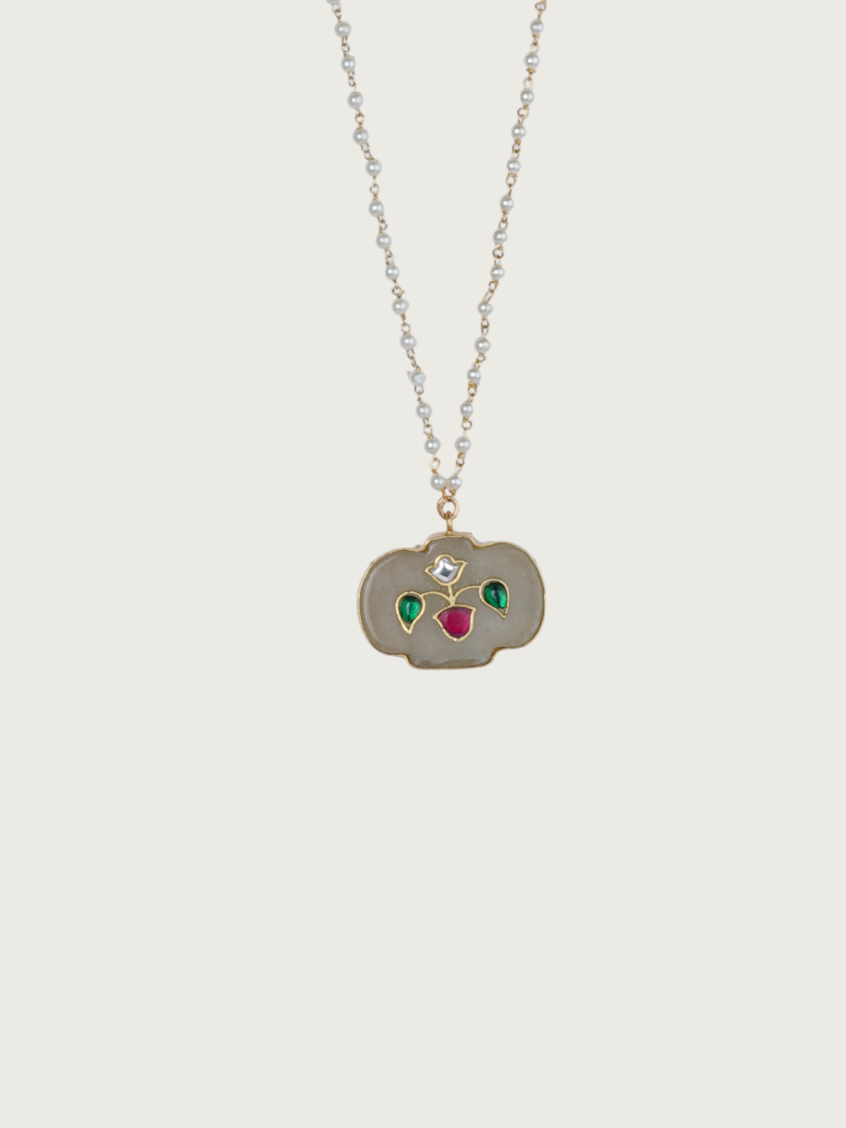 Add a subtle touch of heritage charm to your everyday look with this handcrafted mini pendant necklace. Suspended on a delicate beaded chain, the pendant features a muted pastel grey enamel base adorned with intricate kundan work. The design includes green and pink accents in a floral-inspired motif, giving it a refined elegance with a hint of playfulness.