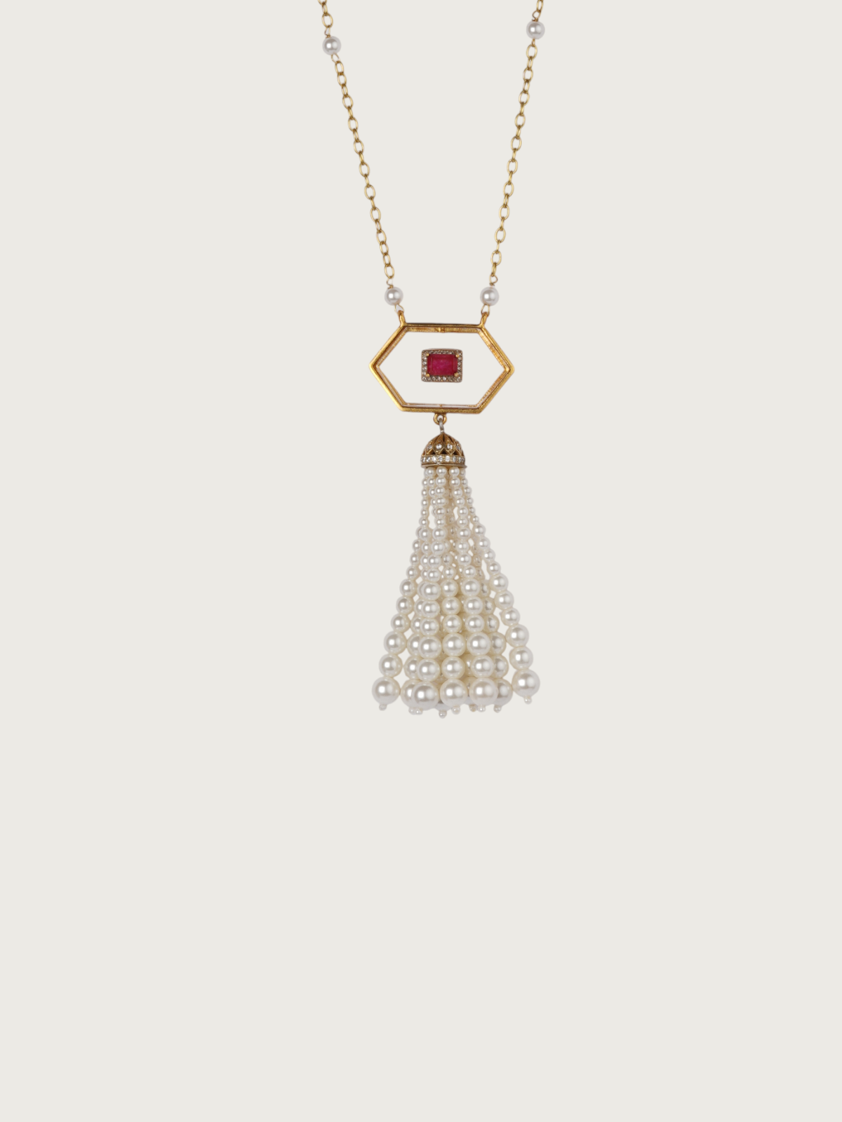 Elevate your look with this modern take on traditional elegance. This 925 silver necklace features a distinctive hexagon-shaped frame holding a ruby-hued centerpiece that adds a regal charm. The pendant gracefully descends into a cascading tassel made of lustrous pearl strands, exuding a sense of rhythm and movement.