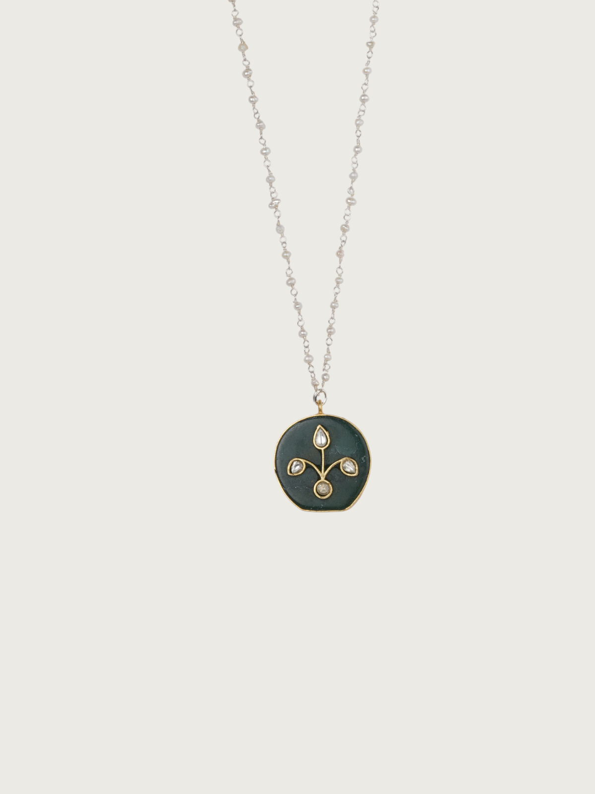 Celebrate timeless craftsmanship with this handcrafted necklace featuring a rich dark green endant necklace on a delicate pearl-beaded chain. The round pendant showcases a minimalistic floral motif in gold detailing, accented with white kundan stones that bring a soft shimmer to its deep green base. Its subtle elegance makes it easy to layer or wear solo, offering a refined charm that suits both contemporary and traditional styles. Finished with a silver-toned setting, this necklace blends old-world artistry with modern simplicity.